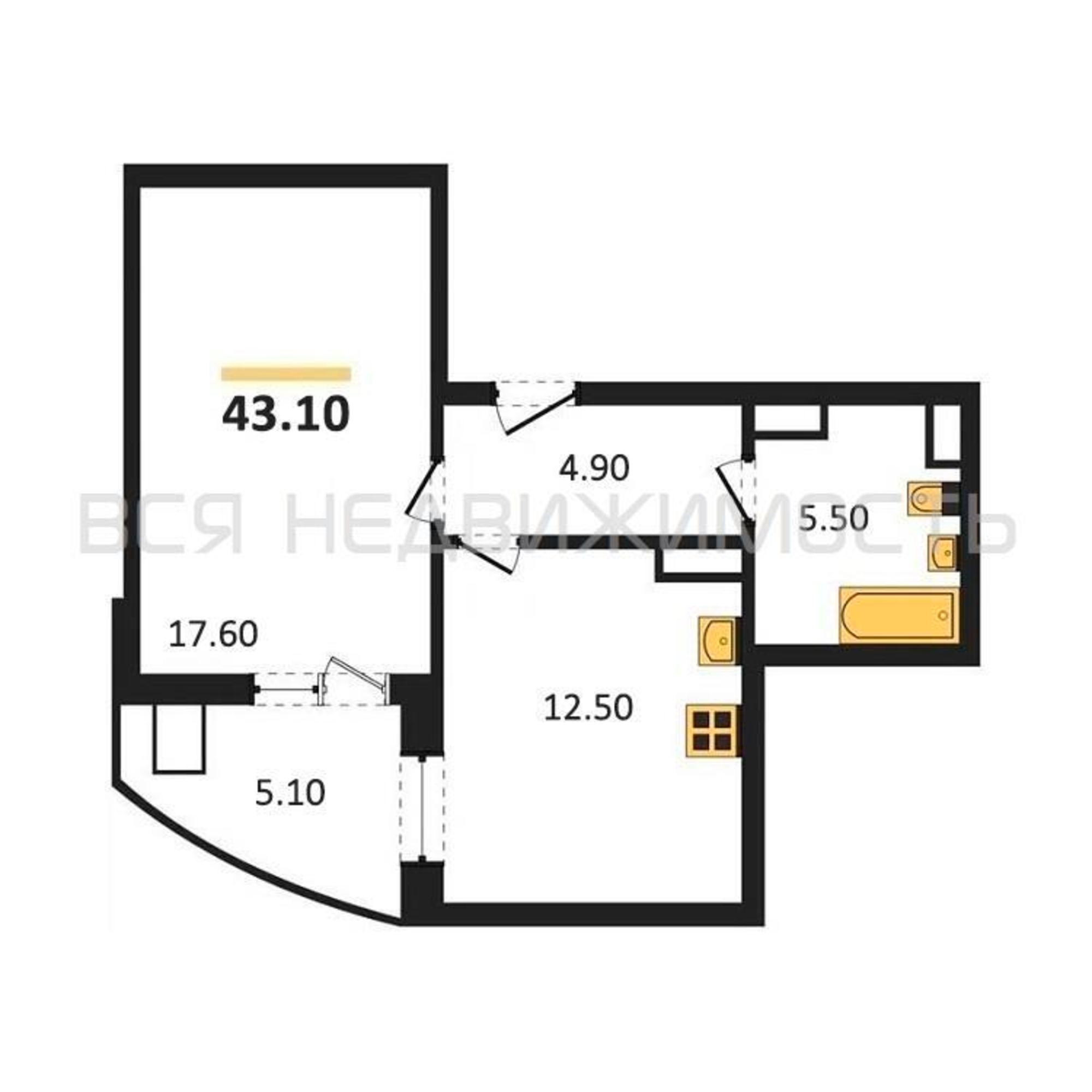1-комнатная квартира, 43.10 м² 6/17 этаж ID объекта 100125238