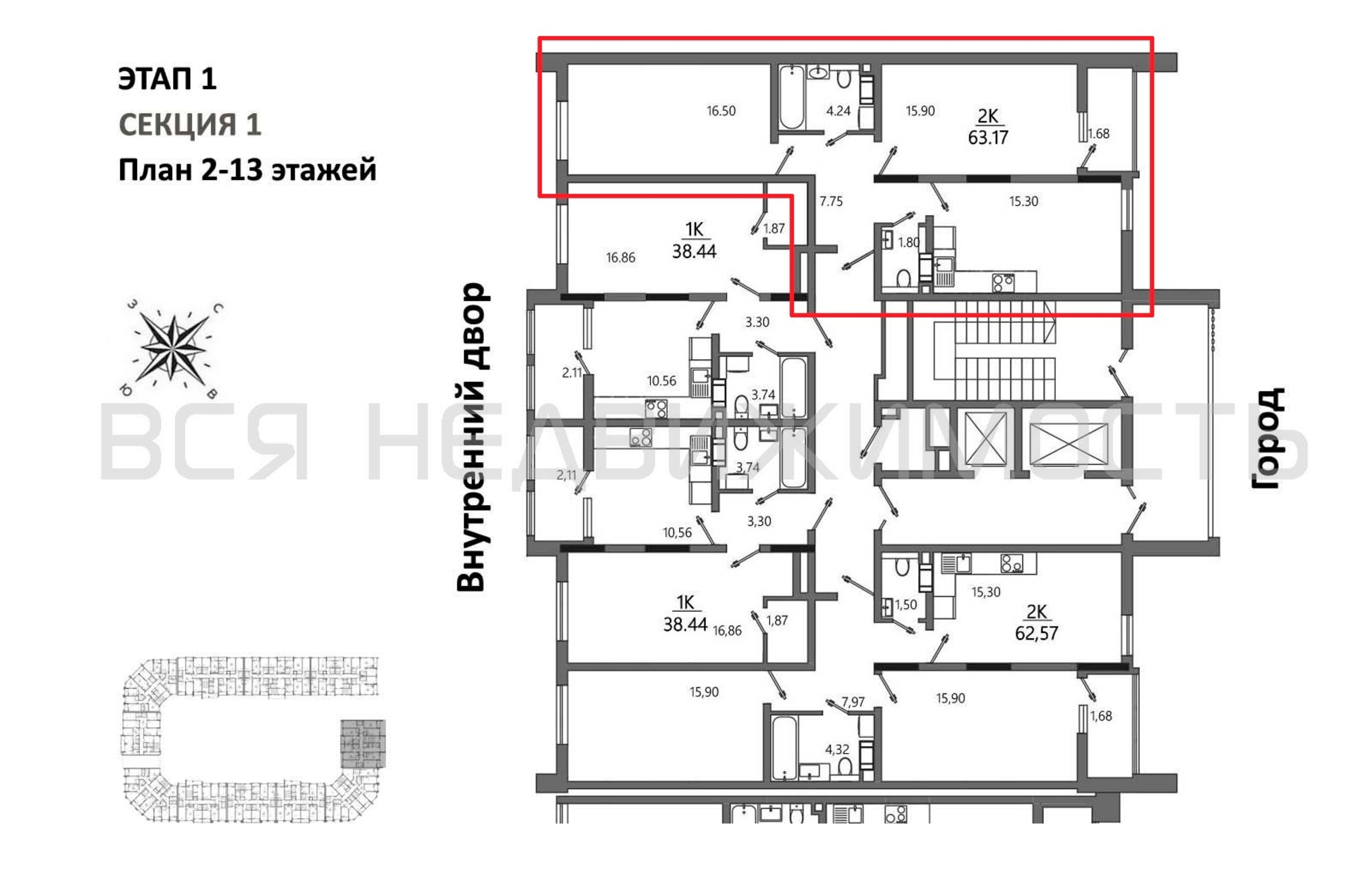 2-комнатная квартира, 63.17 м² 11/13 этаж ID объекта 100127328