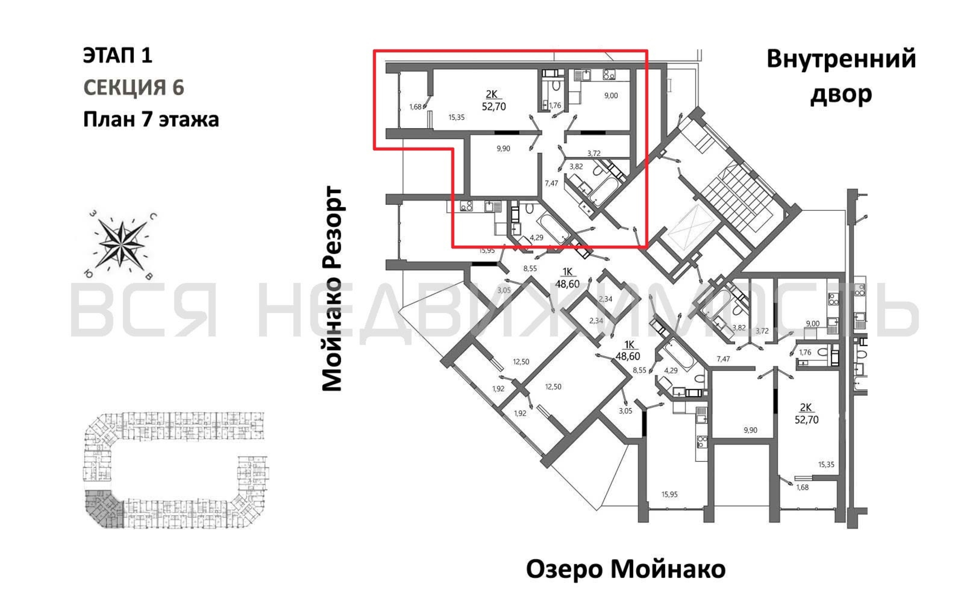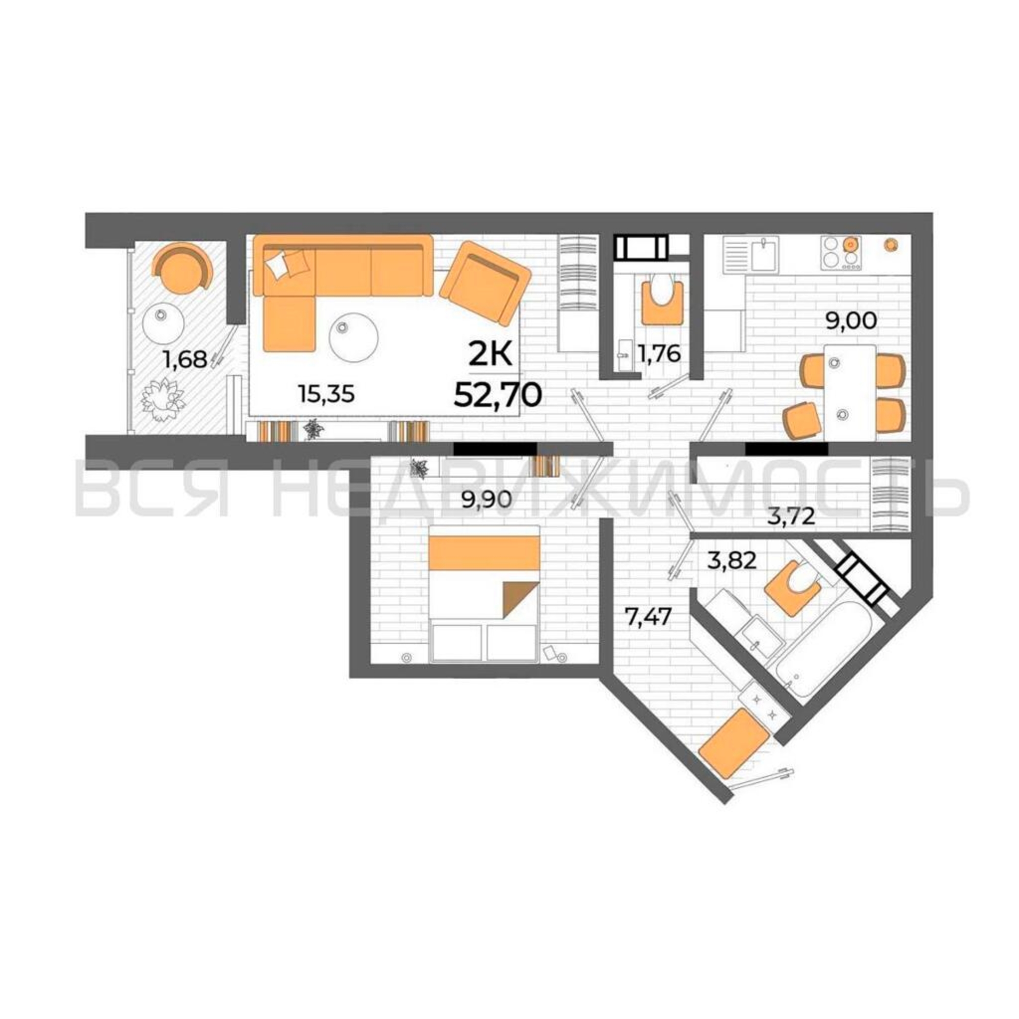 2-комнатная квартира, 52.70 м² 7/7 этаж ID объекта 100127333