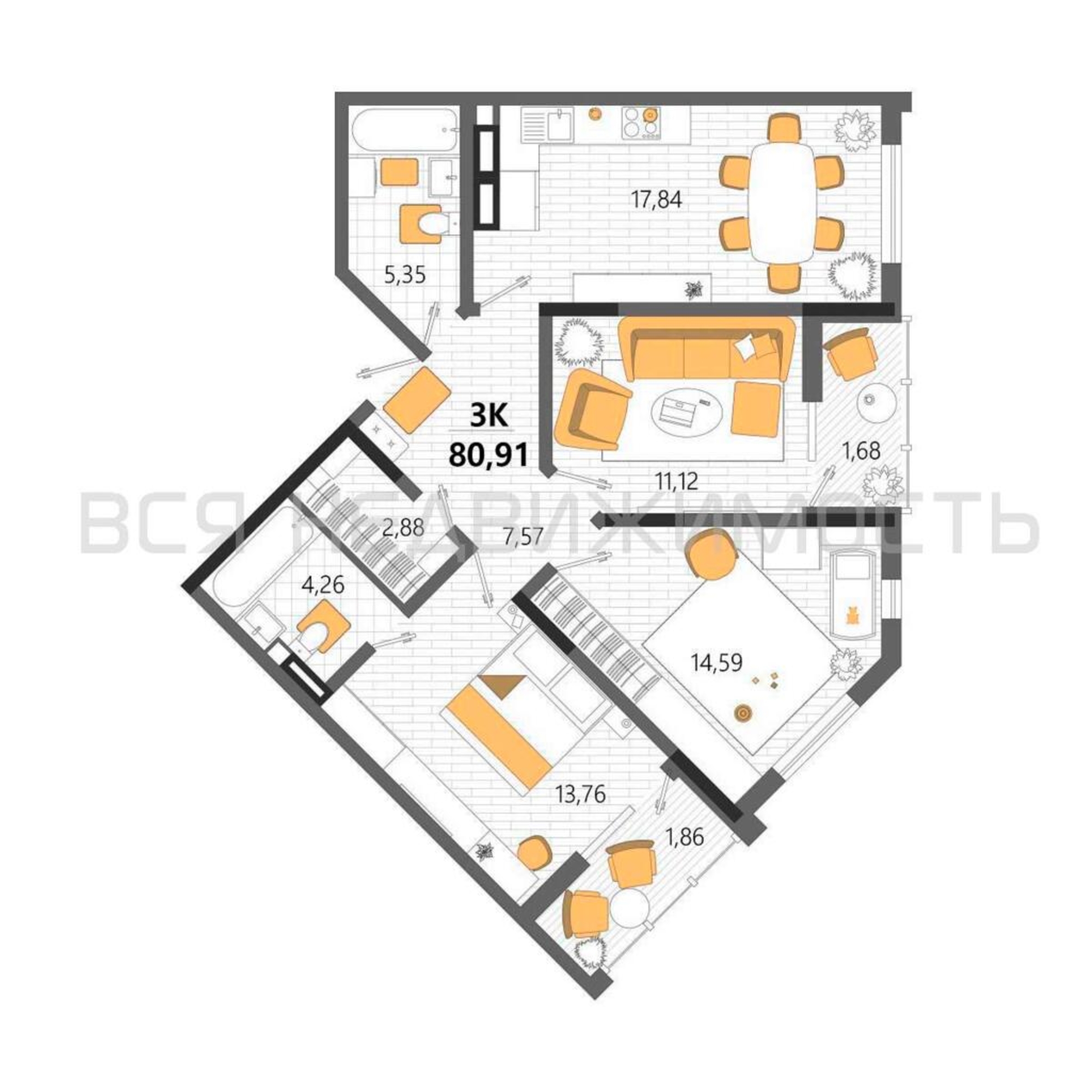 3-комнатная квартира, 80.91 м² 2/9 этаж ID объекта 100127351