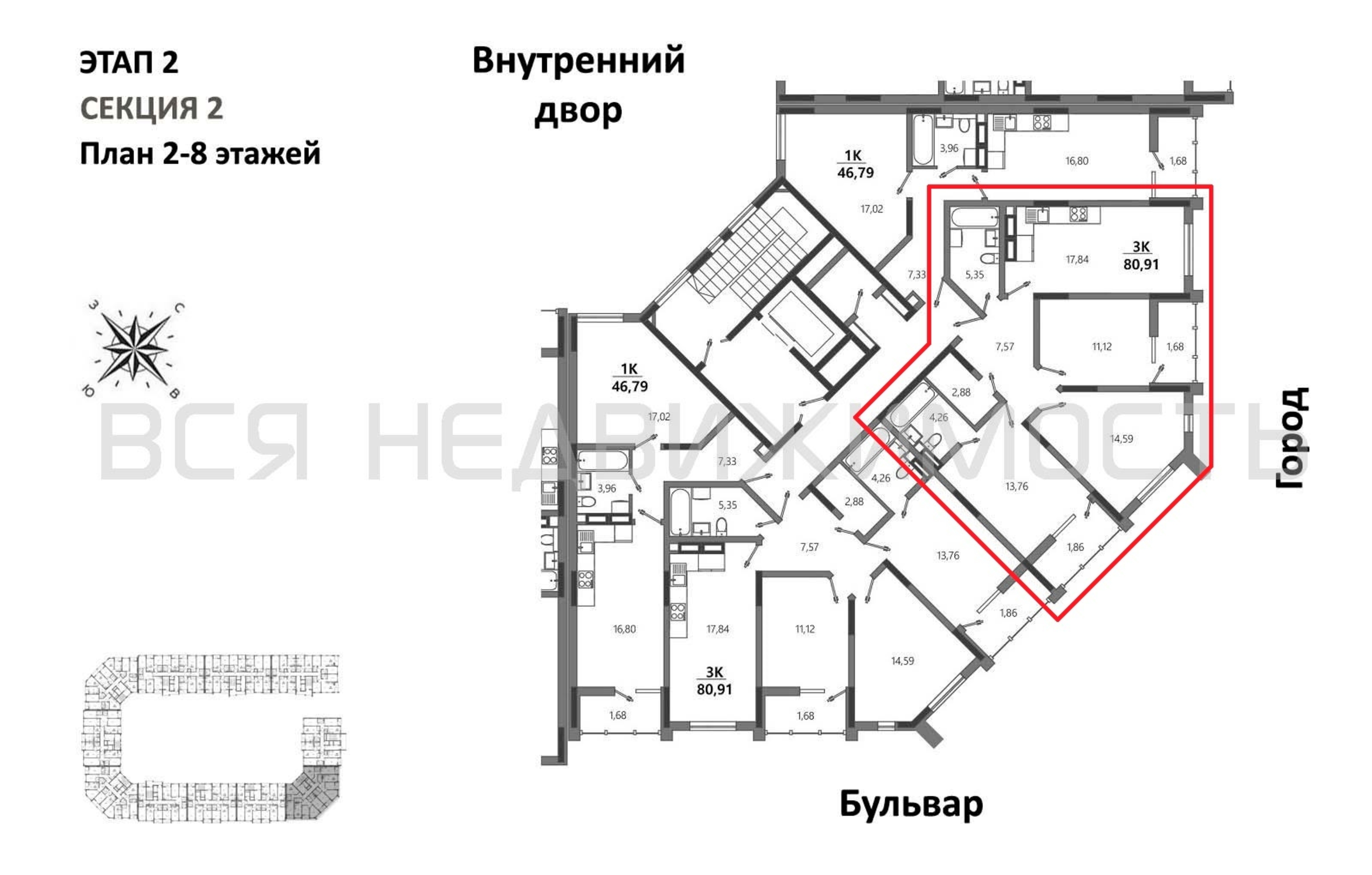 3-комнатная квартира, 80.91 м² 7/9 этаж ID объекта 100127356