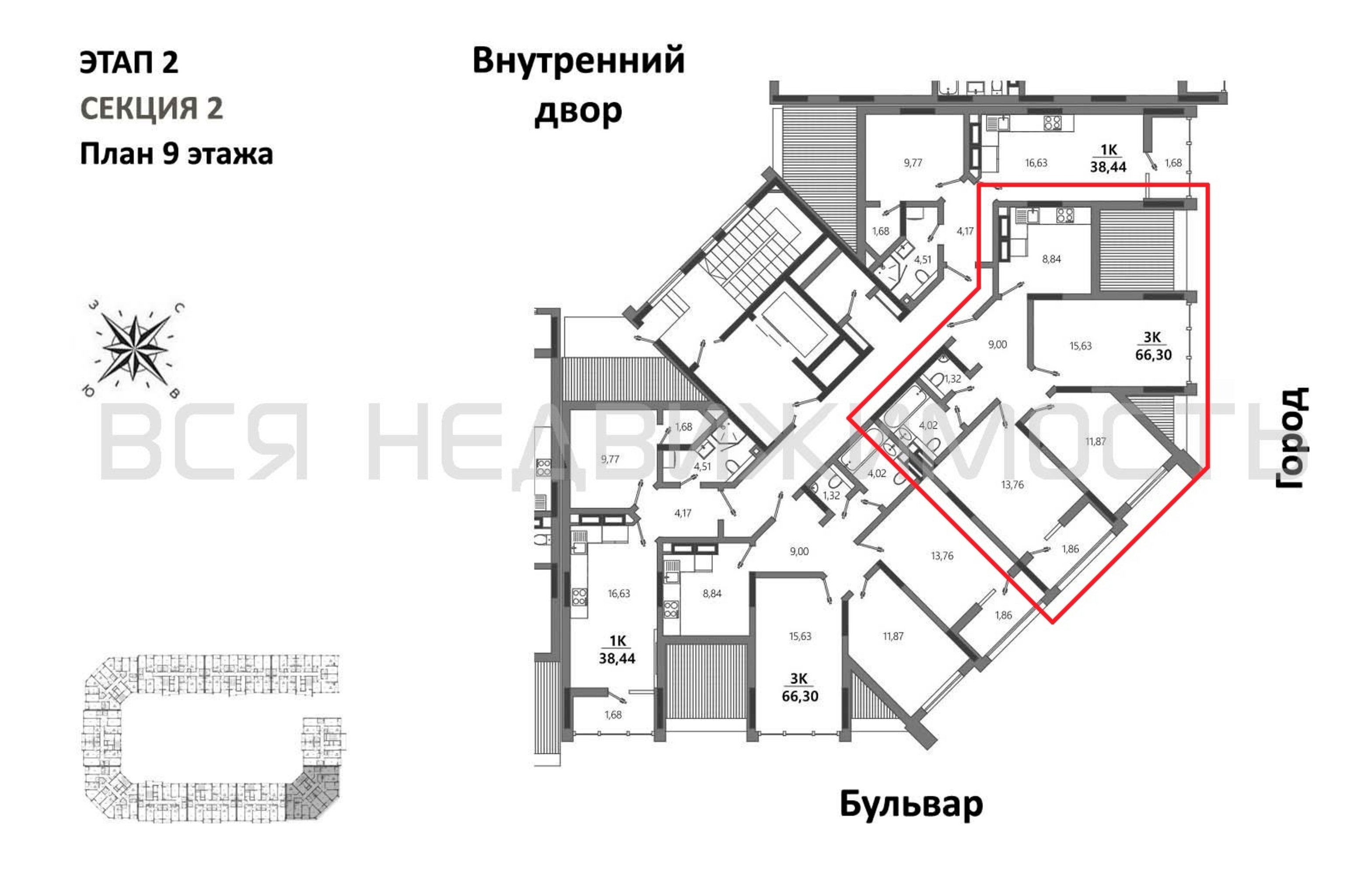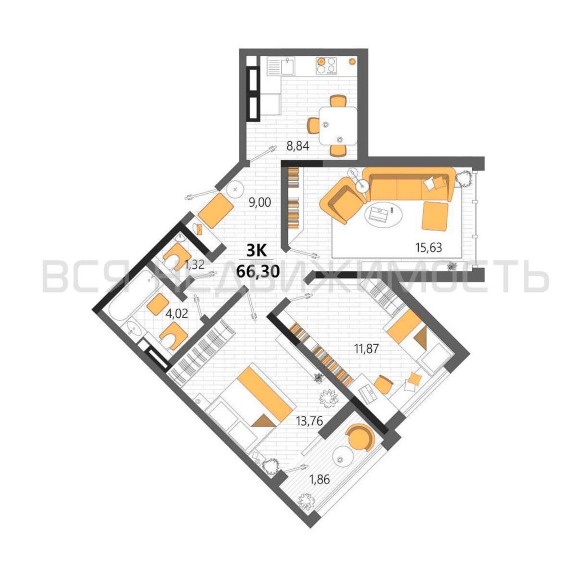 3-комнатная квартира, 66.30 м² 9/9 этаж ID объекта 100127361