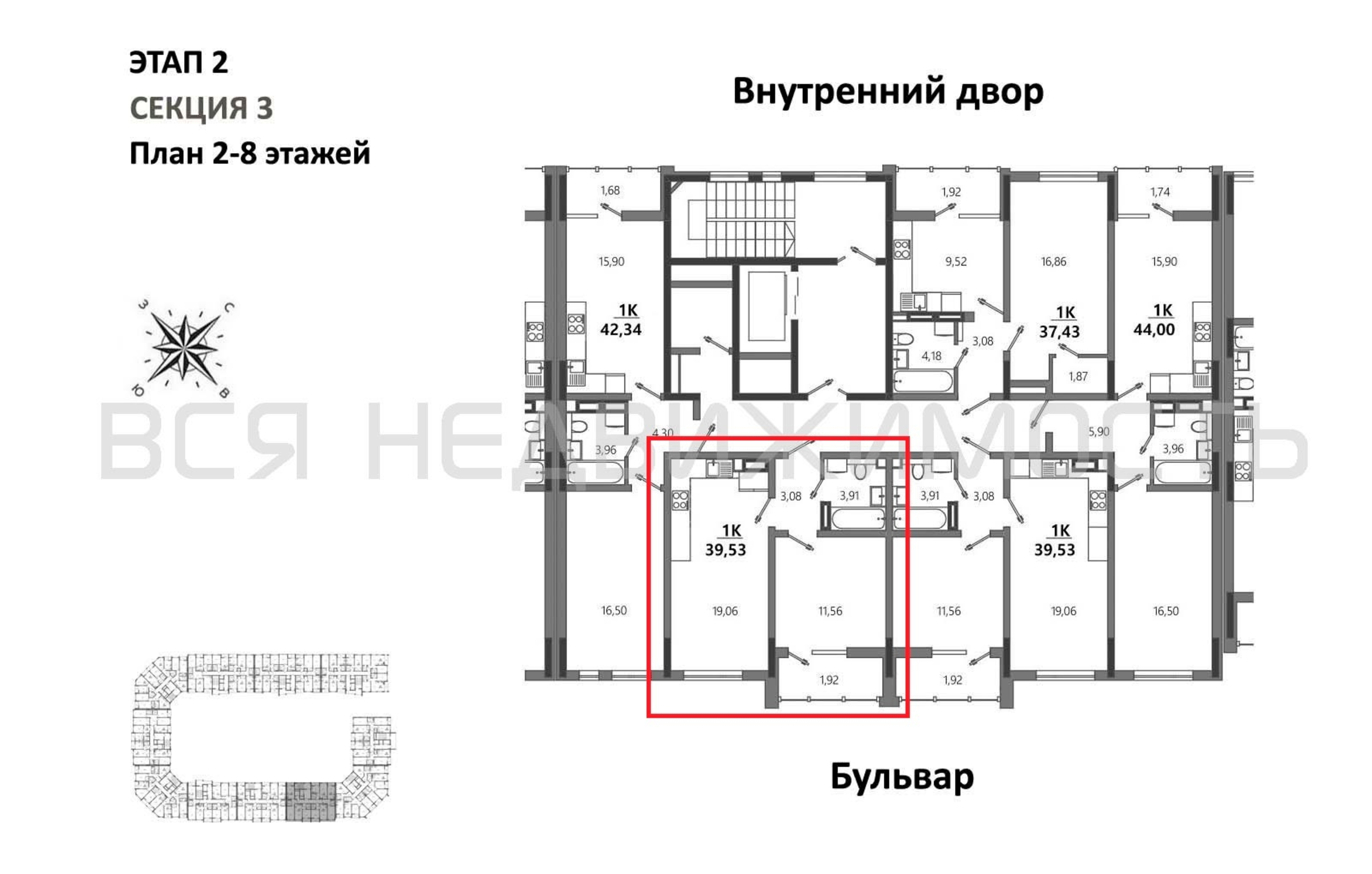 1-комнатная квартира, 39.53 м² 8/9 этаж ID объекта 100127364