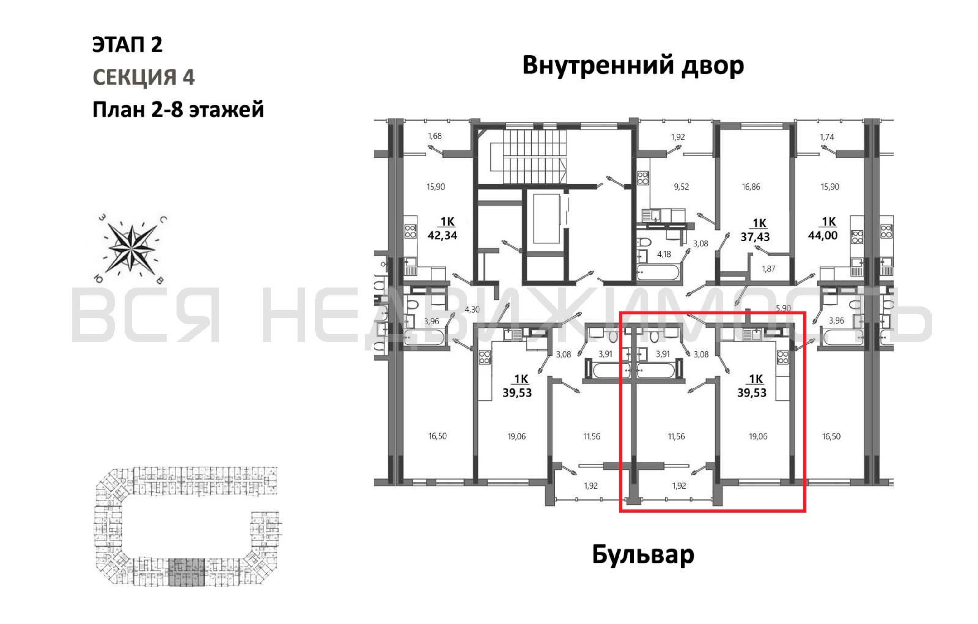1-комнатная квартира, 39.53 м² 8/9 этаж ID объекта 100127369