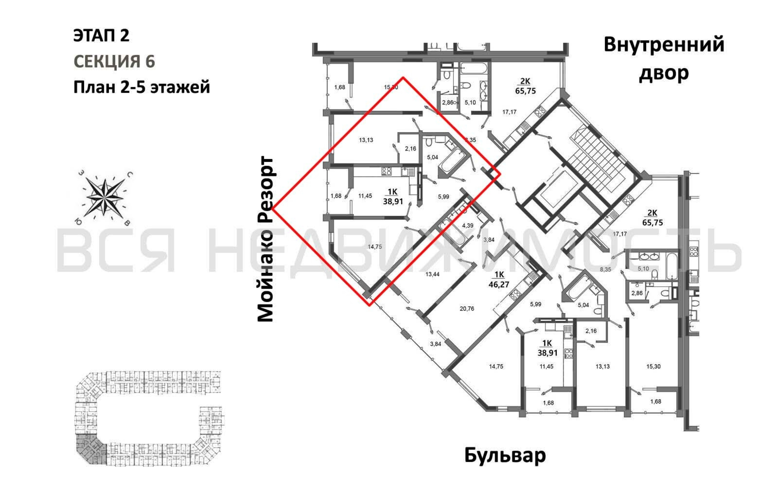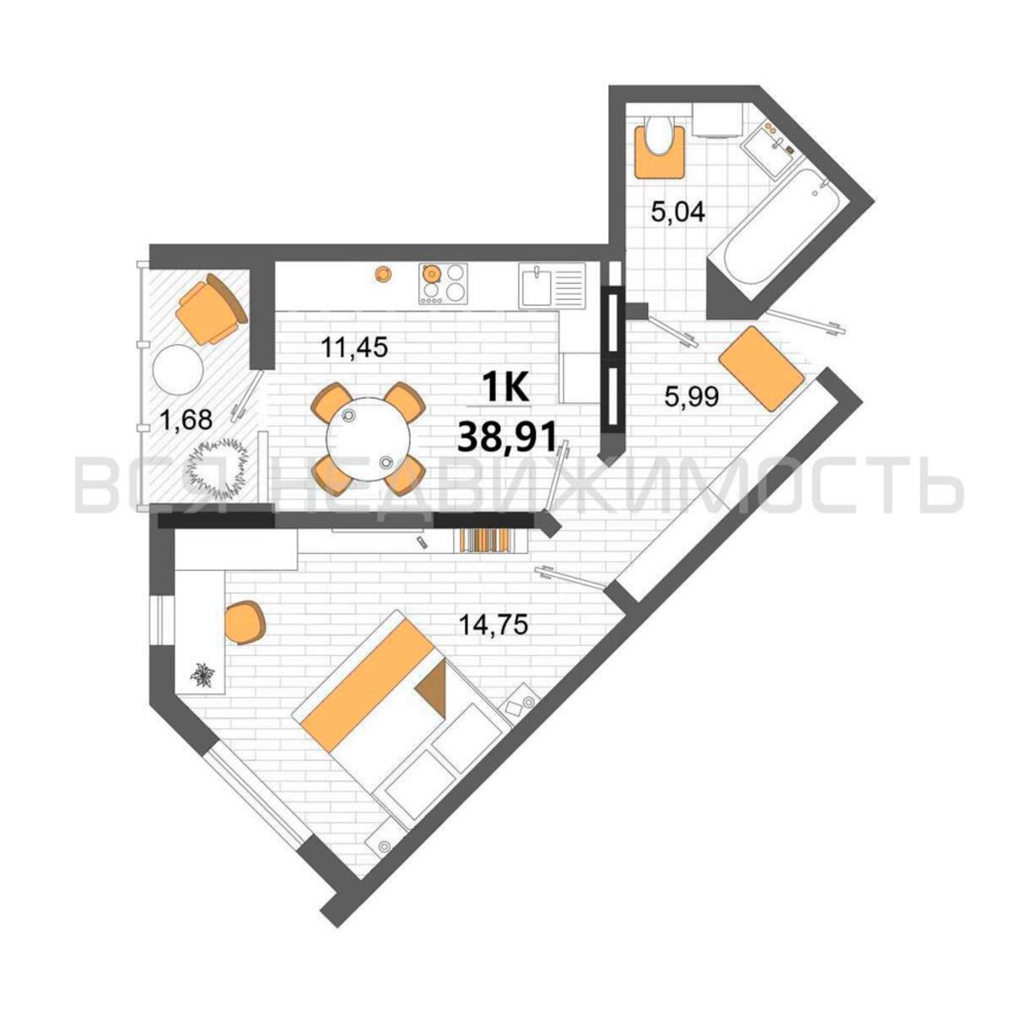 1-комнатная квартира, 38.91 м² 4/6 этаж ID объекта 100127385