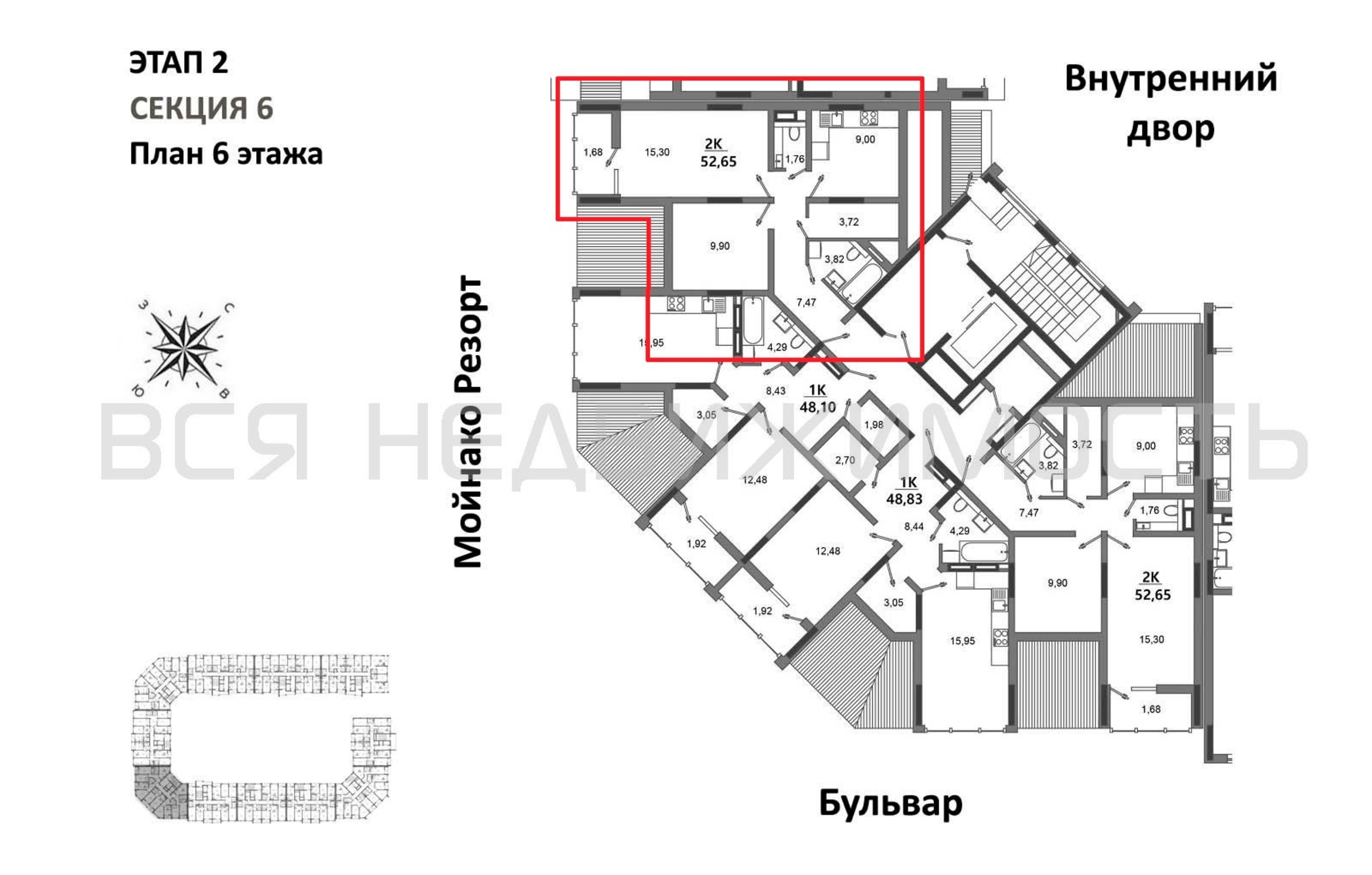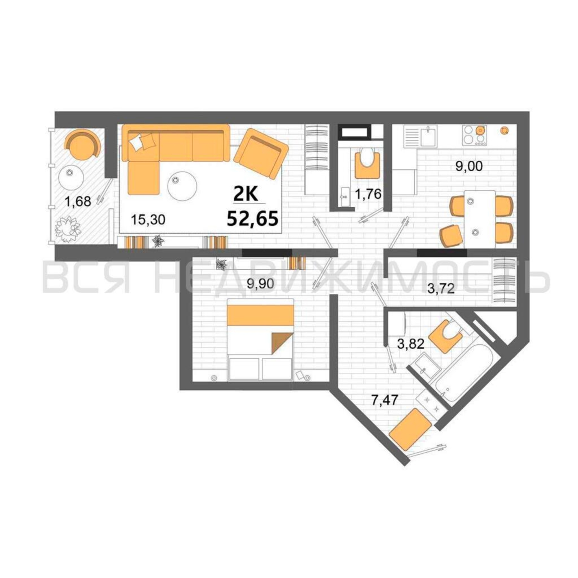 2-комнатная квартира, 52.65 м² 6/6 этаж ID объекта 100127391
