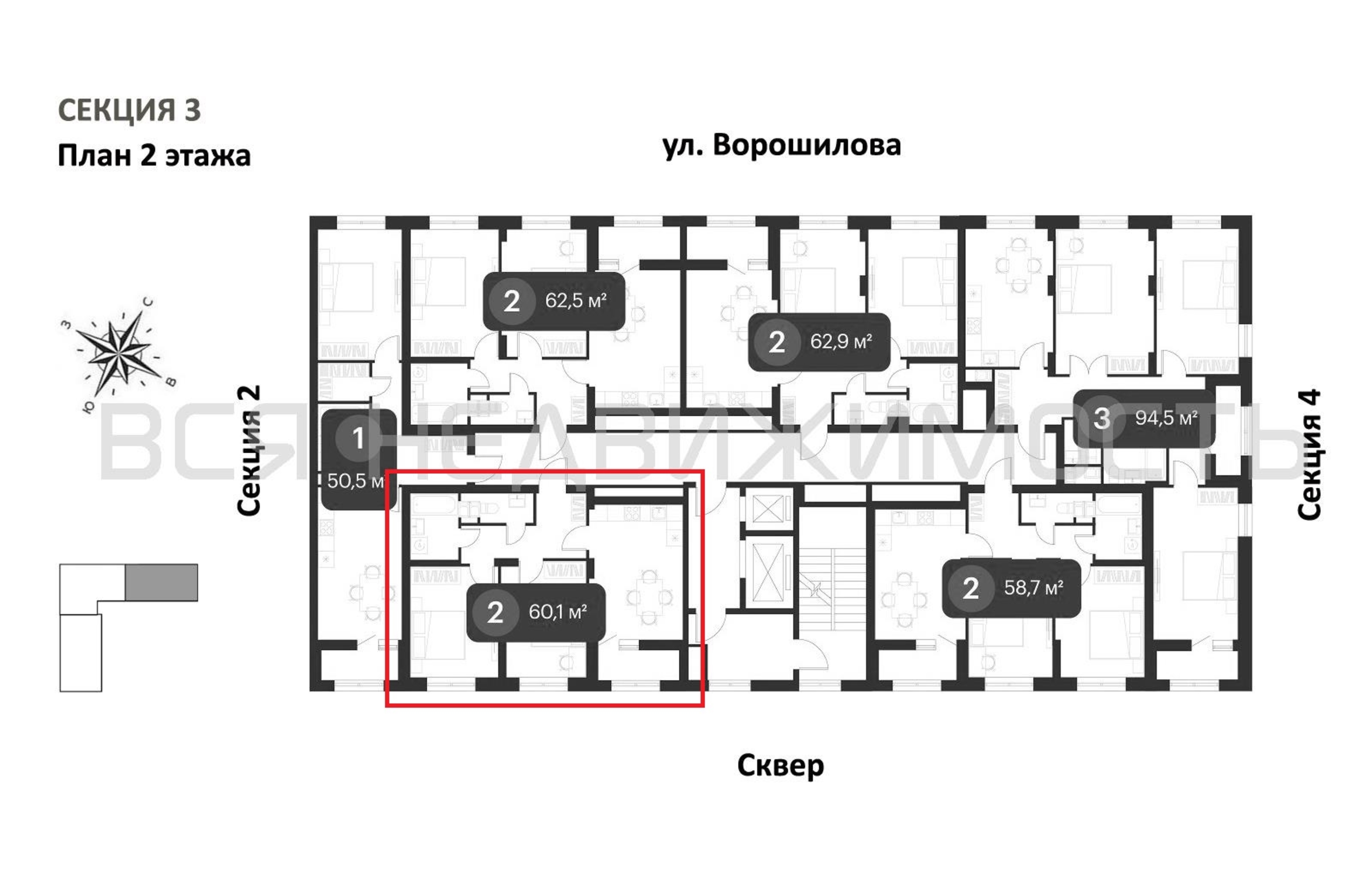 2-комнатная квартира, 60.10 м² 2/25 этаж ID объекта 100129672