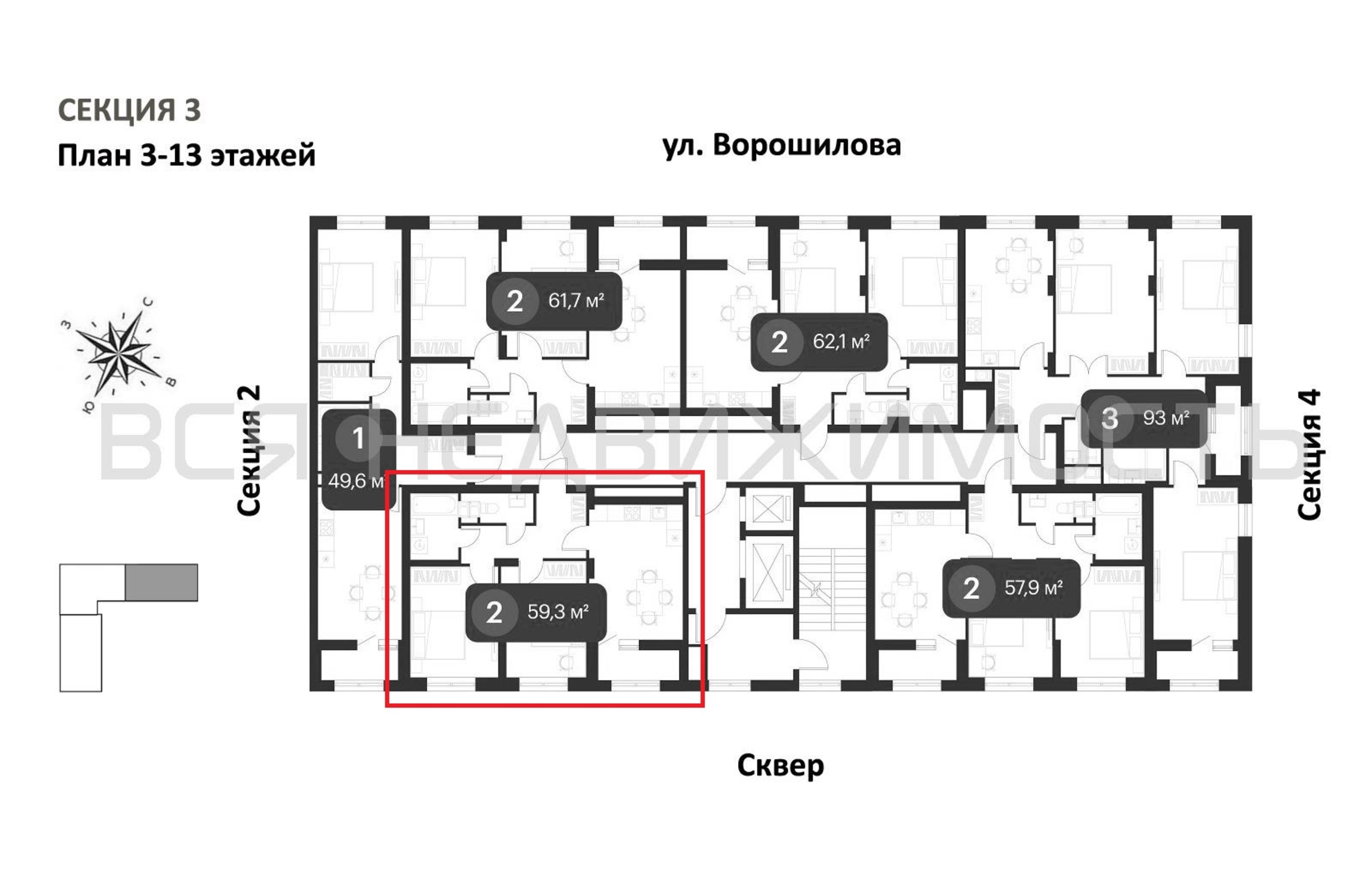 2-комнатная квартира, 59.30 м² 3/25 этаж ID объекта 100129678