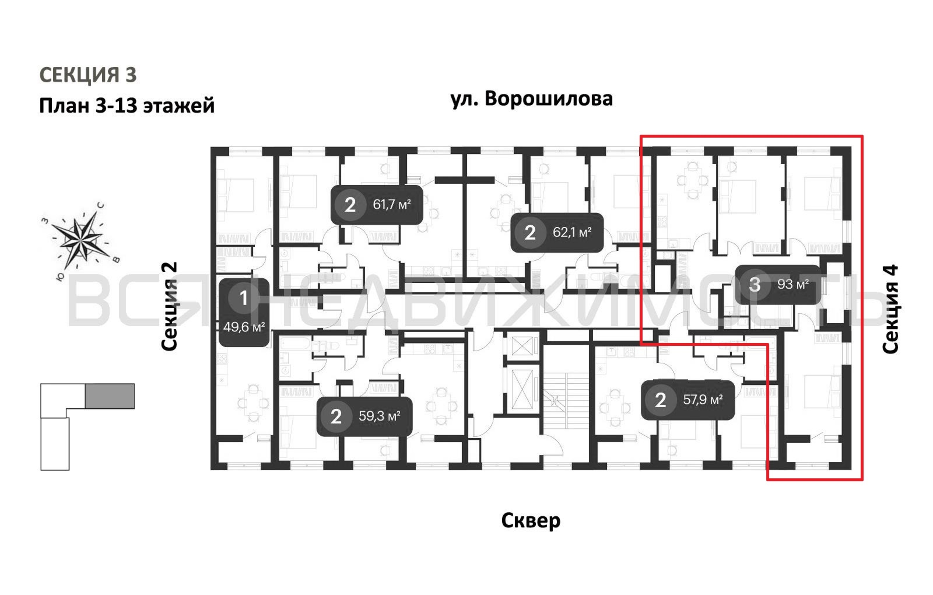 3-комнатная квартира, 93.00 м² 12/25 этаж ID объекта 100129736