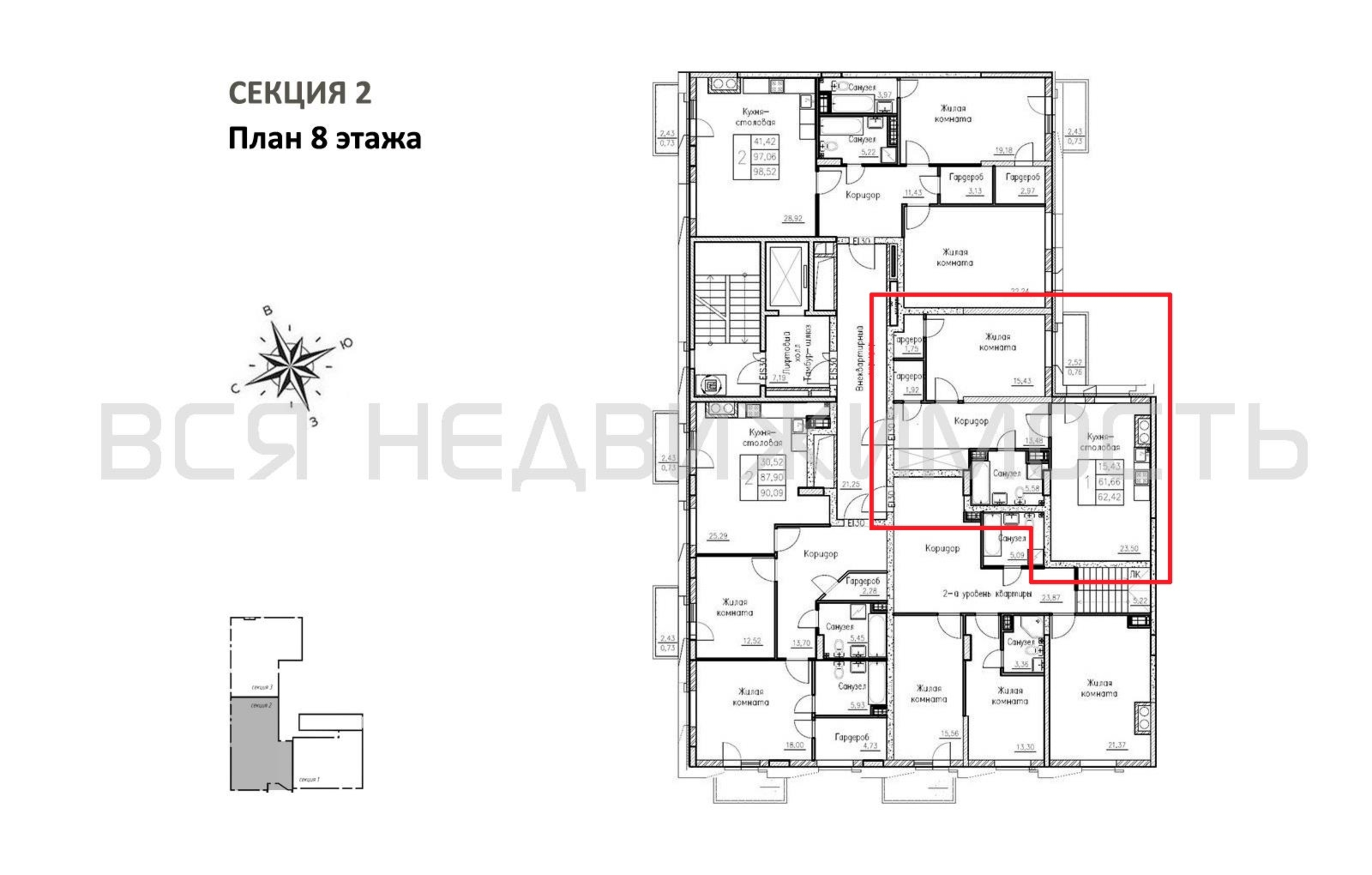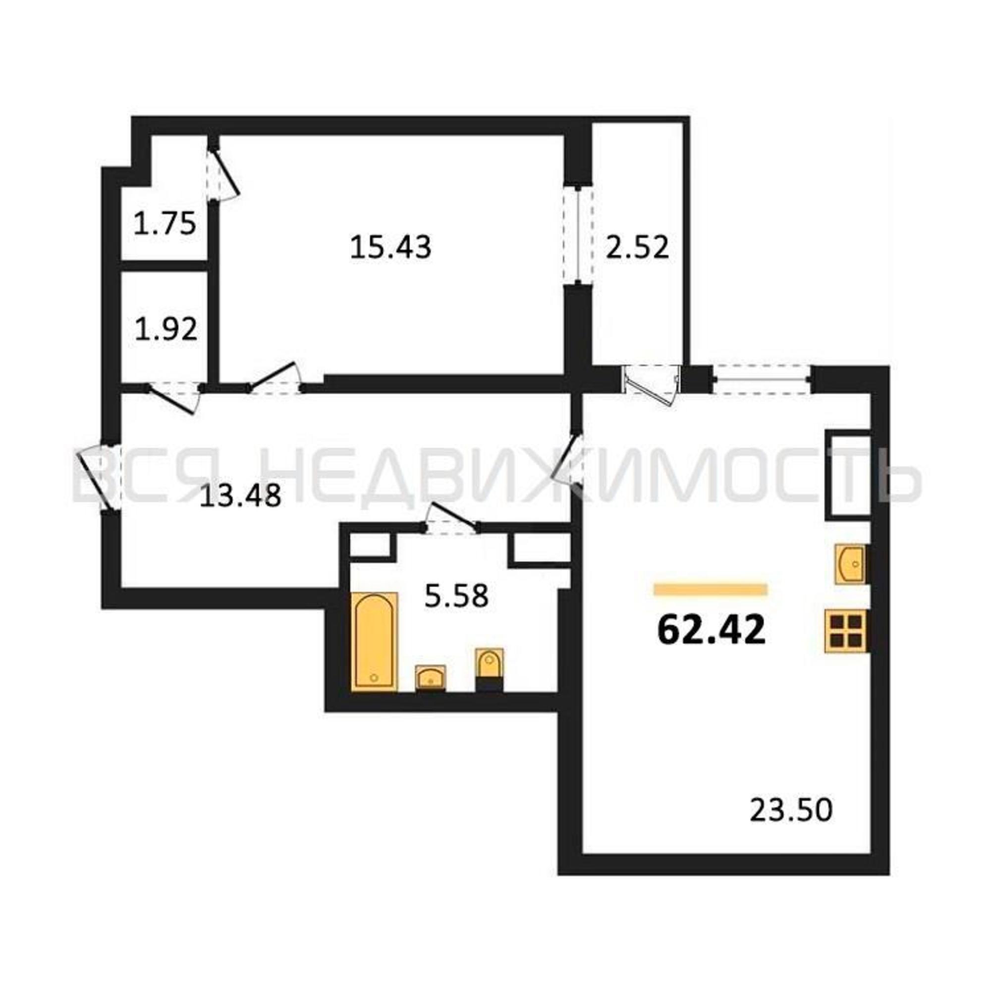 1-комнатная квартира, 62.42 м² 8/9 этаж ID объекта 100129799