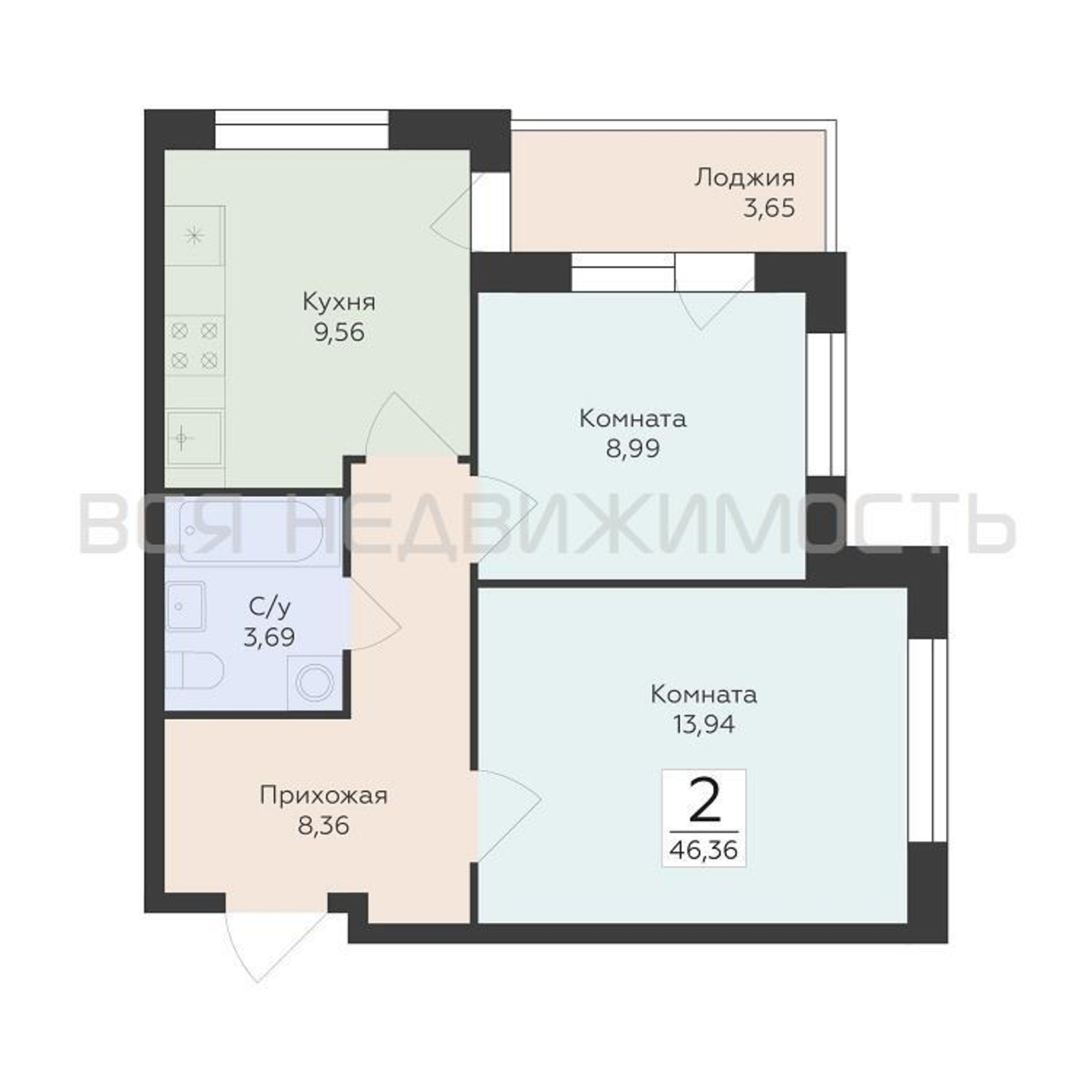 2-комнатная квартира, 46.36 м² 2/17 этаж ID объекта 100130126