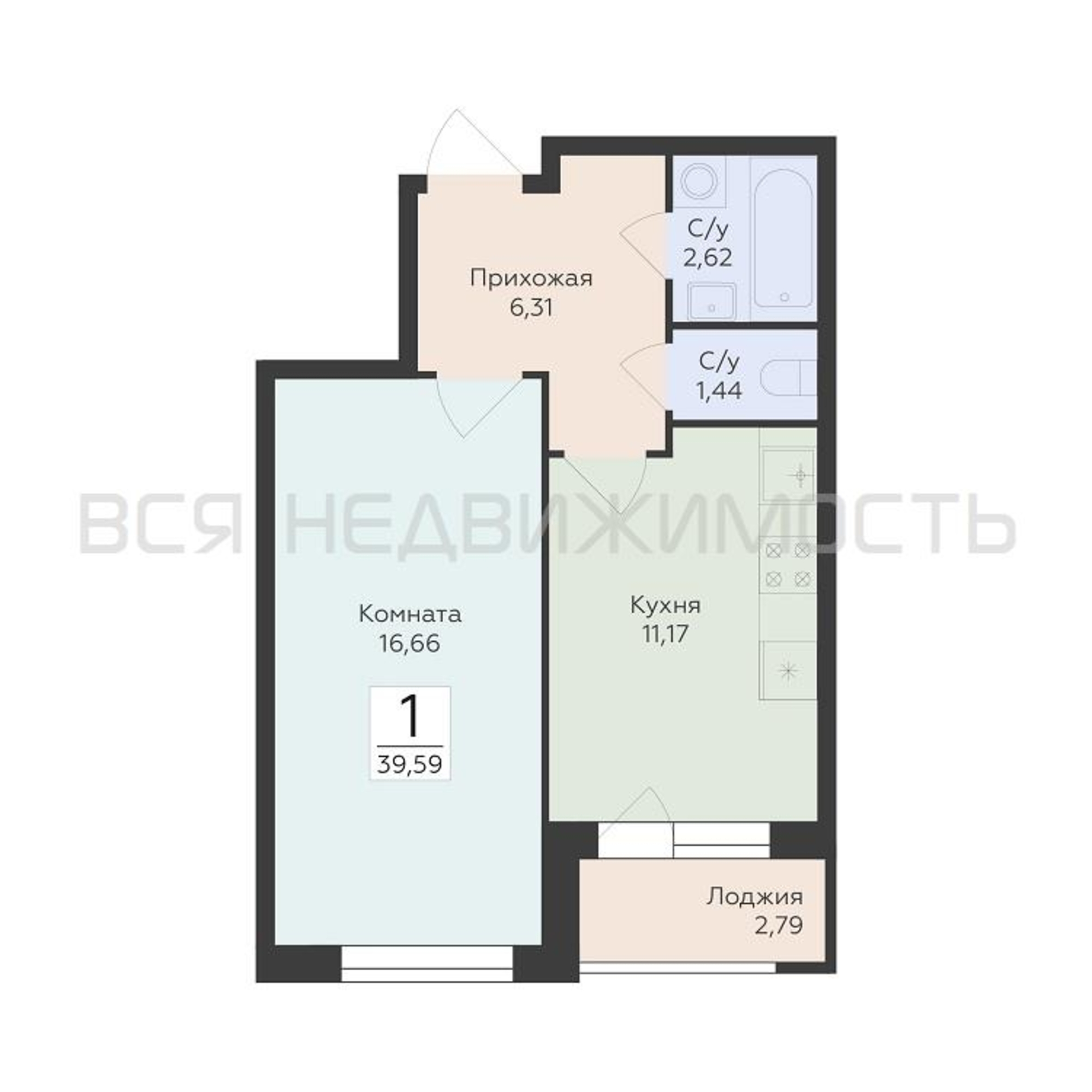 1-комнатная квартира, 39.59 м² 2/15 этаж ID объекта 100130343