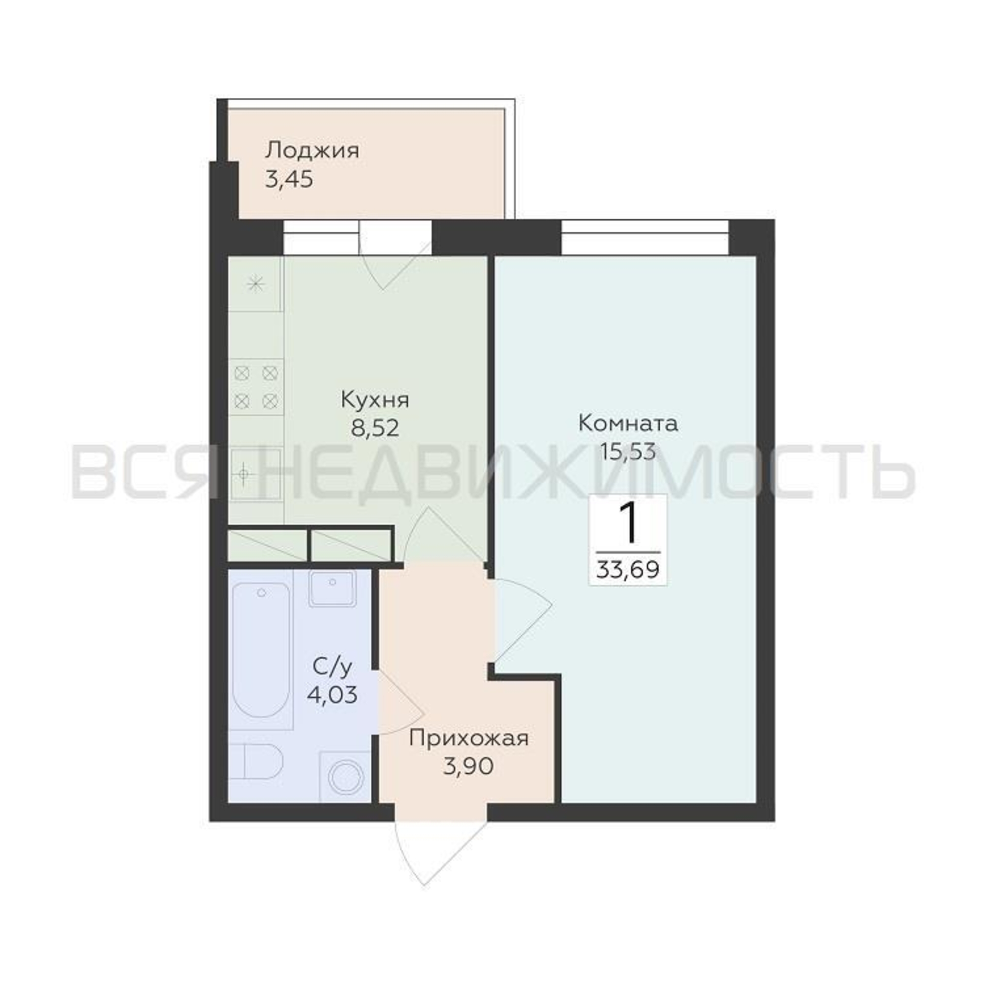 1-комнатная квартира, 33.32 м² 11/15 этаж ID объекта 100130422
