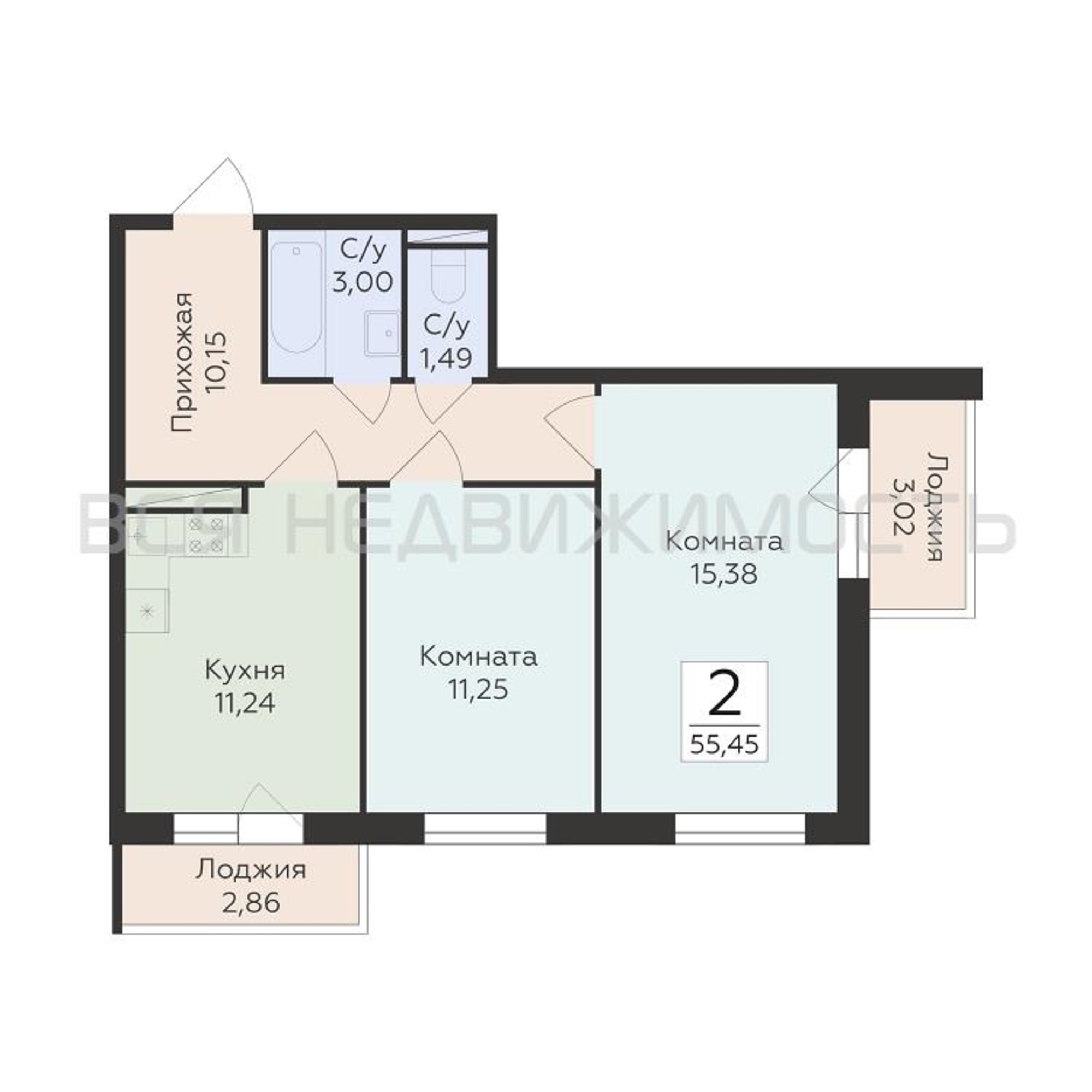 2-комнатная квартира, 55.45 м² 2/18 этаж ID объекта 100130772