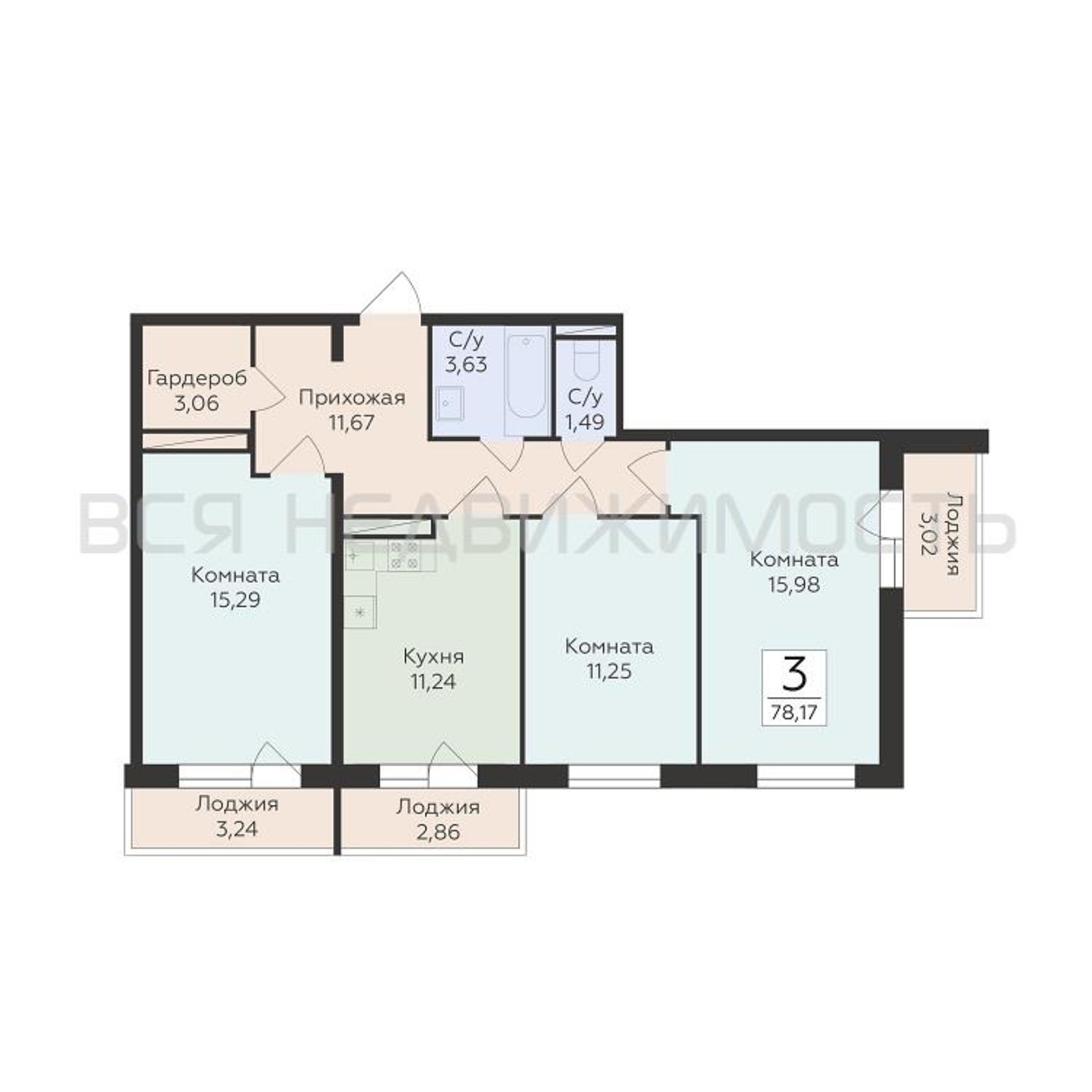 3-комнатная квартира, 78.17 м² 15/18 этаж ID объекта 100130937