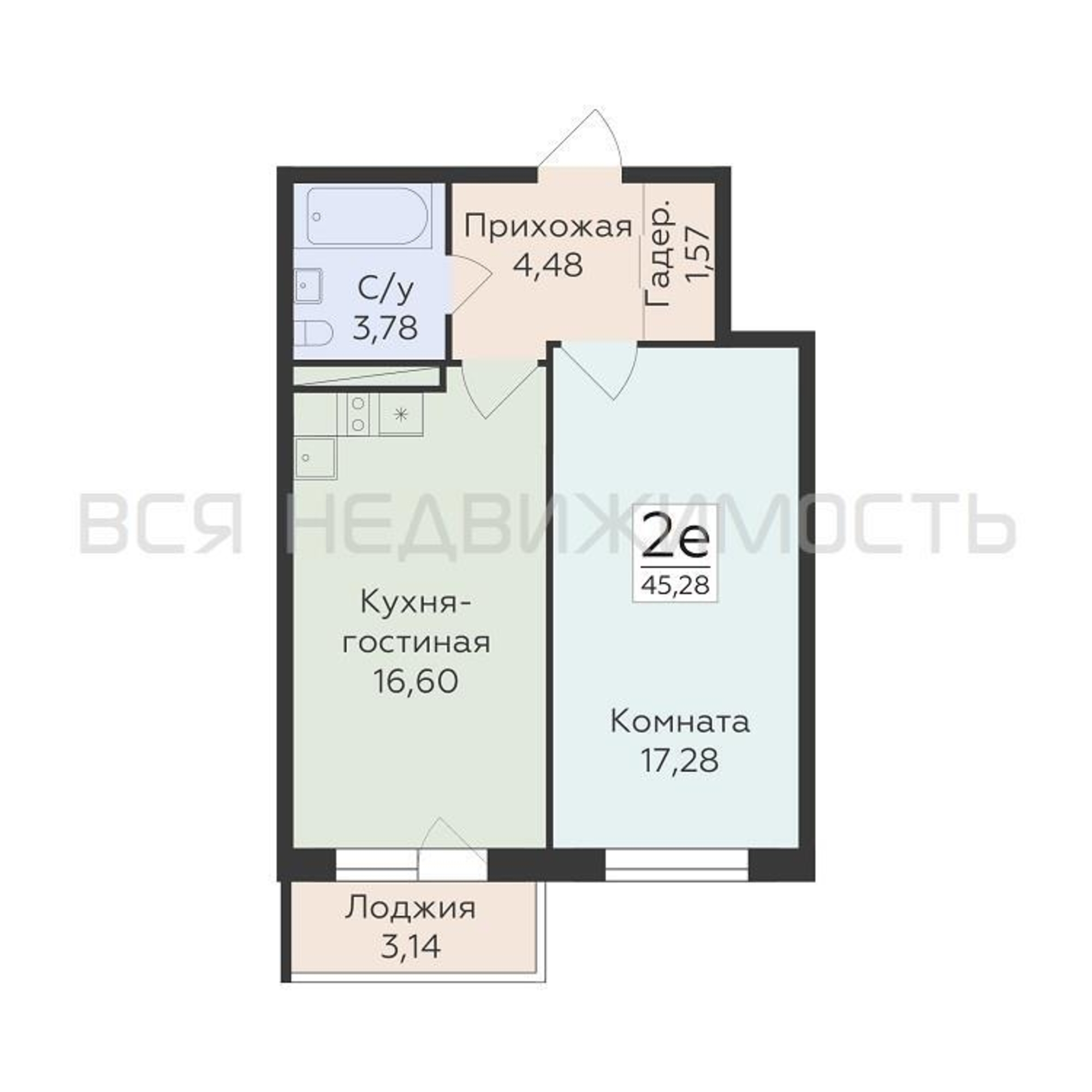 1-комнатная квартира, 45.28 м² 8/16 этаж ID объекта 100131060