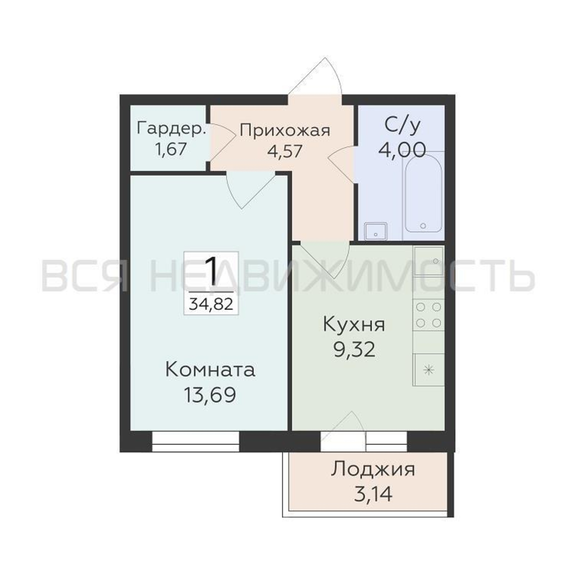 1-комнатная квартира, 34.82 м² 8/16 этаж ID объекта 100131061