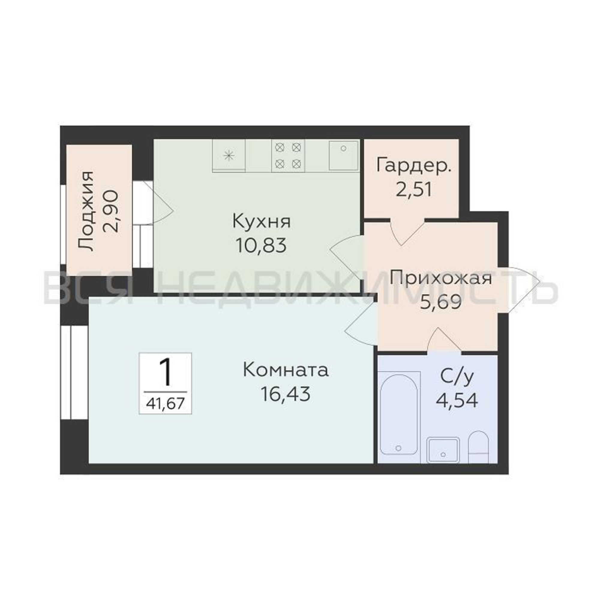 1-комнатная квартира, 41.67 м² 2/12 этаж ID объекта 100131505