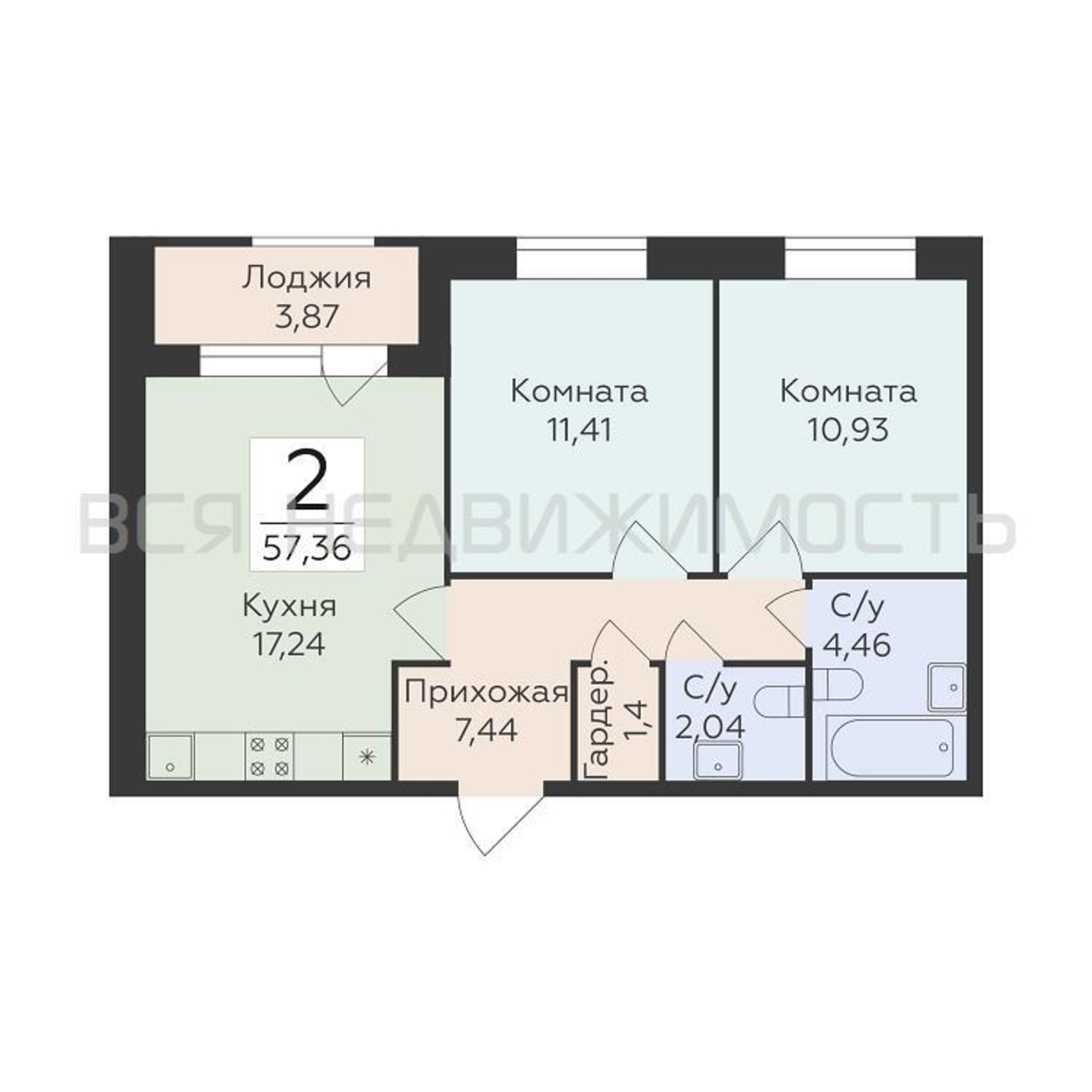 2-комнатная квартира, 57.36 м² 2/12 этаж ID объекта 100131577