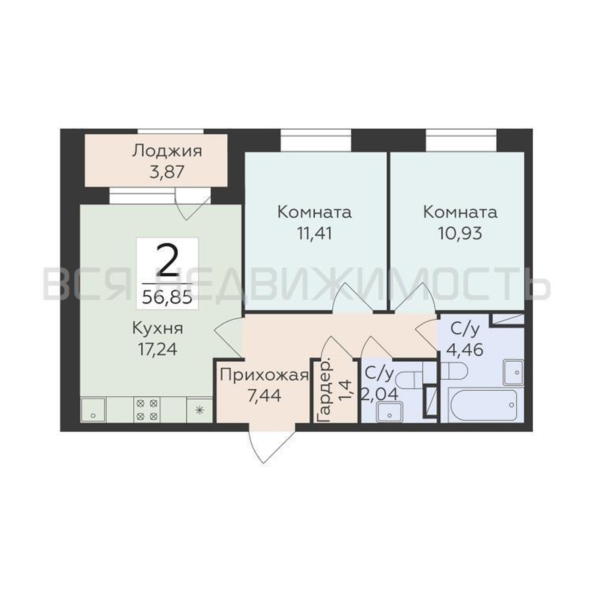2-комнатная квартира, 56.85 м² 8/12 этаж ID объекта 100131613