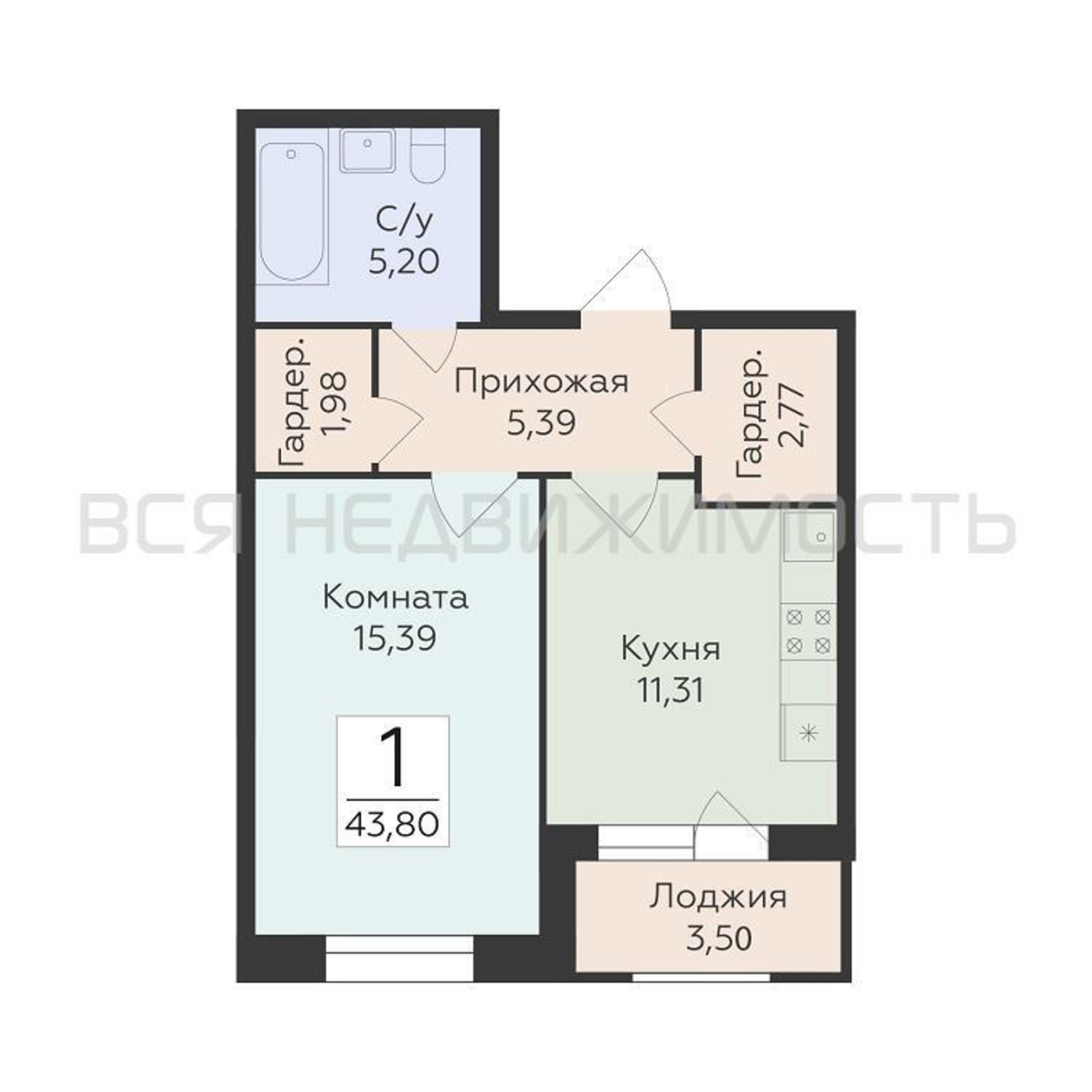 1-комнатная квартира, 43.80 м² 2/18 этаж ID объекта 100131645