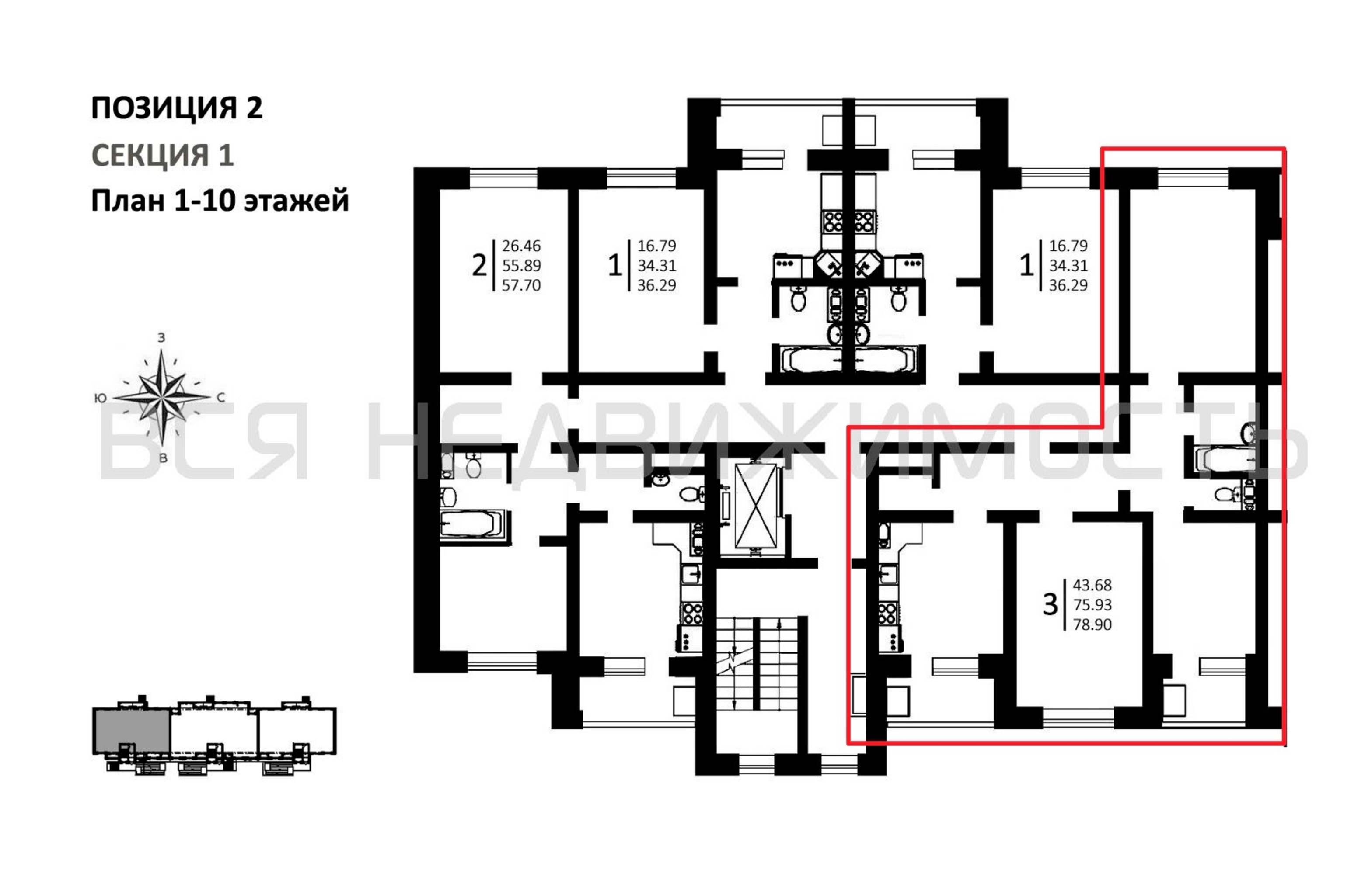 3-комнатная квартира, 78.90 м² 5/10 этаж ID объекта 100132125