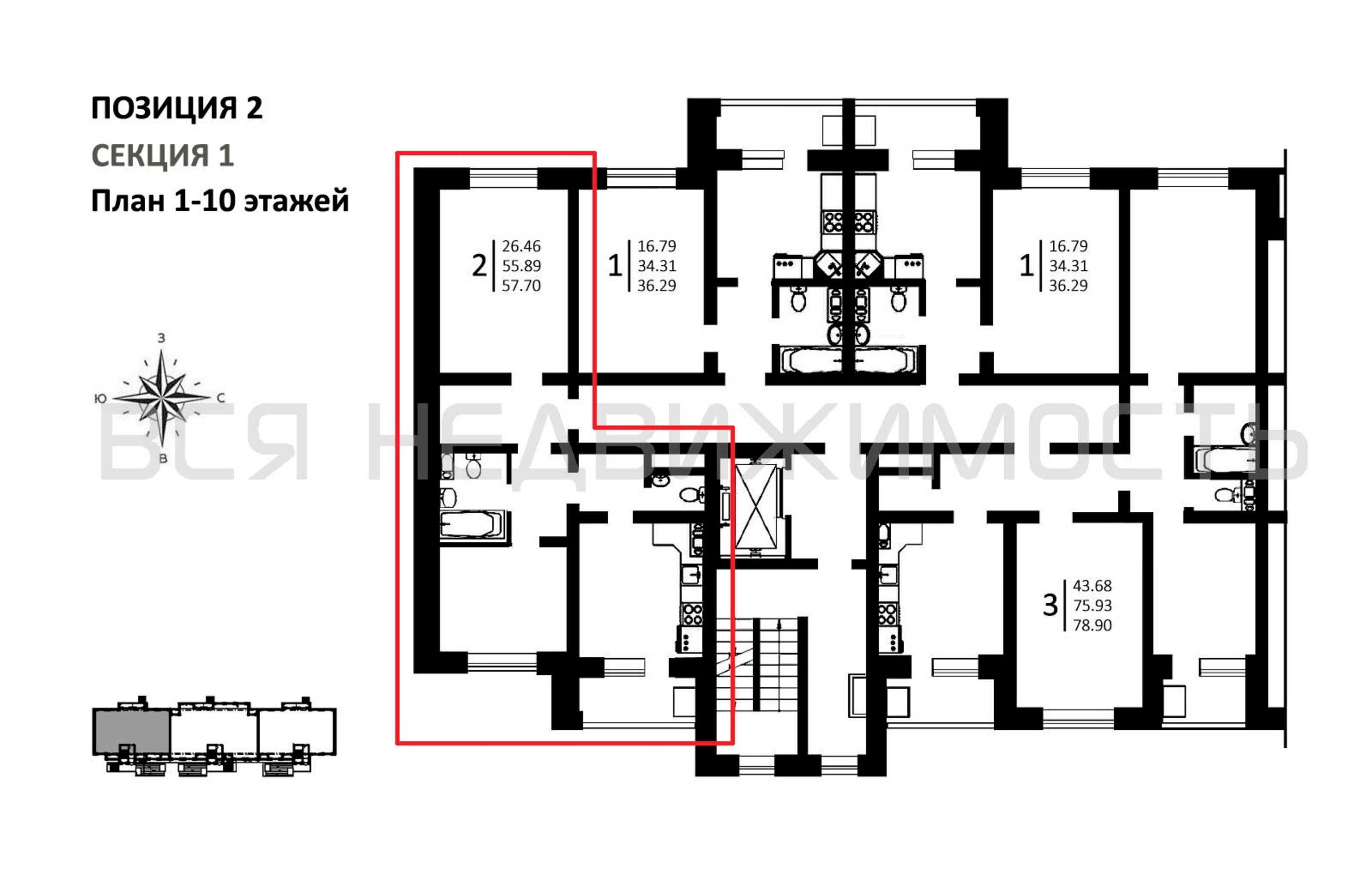 2-комнатная квартира, 57.70 м² 8/10 этаж ID объекта 100132134