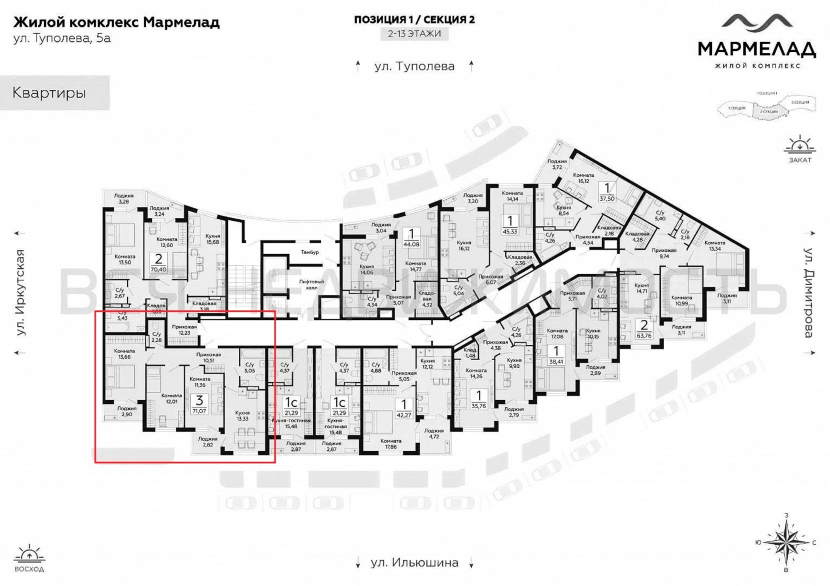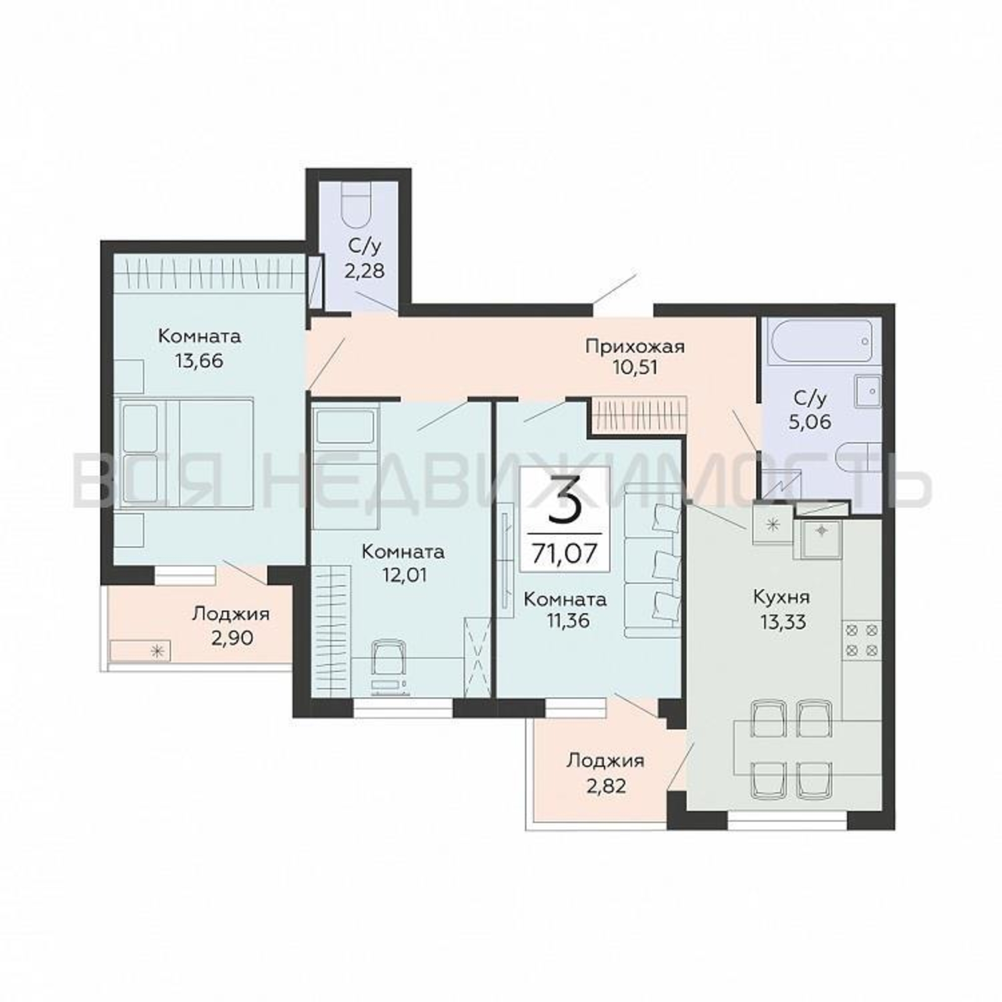 3-комнатная квартира, 71.07 м² 2/13 этаж ID объекта 100132401