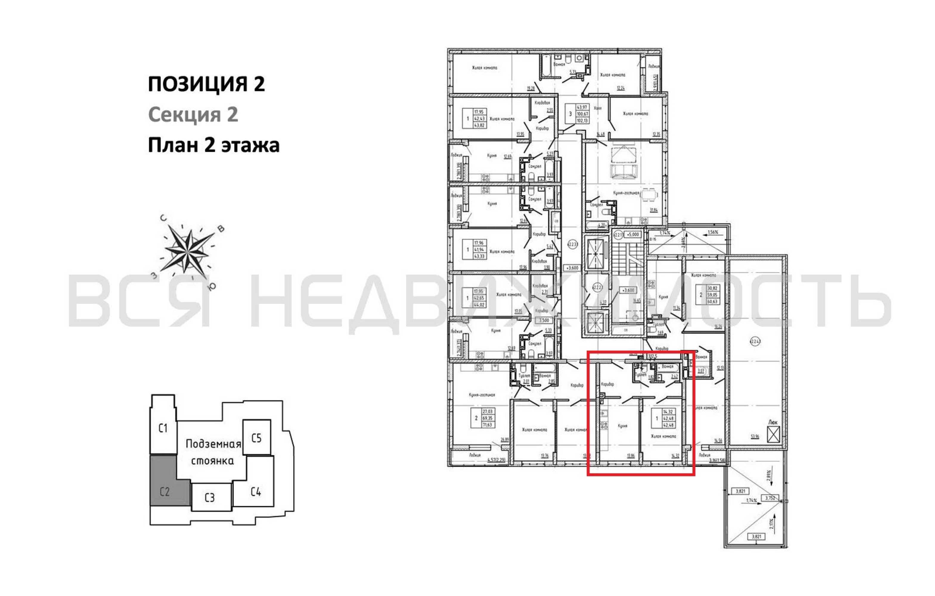 1-комнатная квартира, 42.48 м² 2/18 этаж ID объекта 100133309