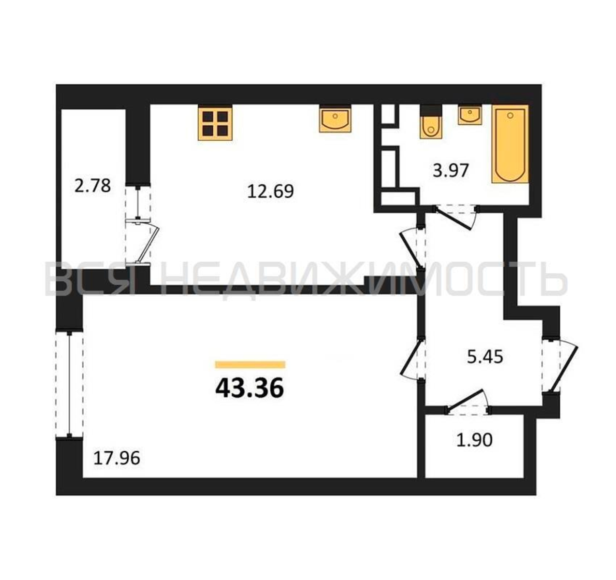 1-комнатная квартира, 43.36 м² 14/18 этаж ID объекта 100133396