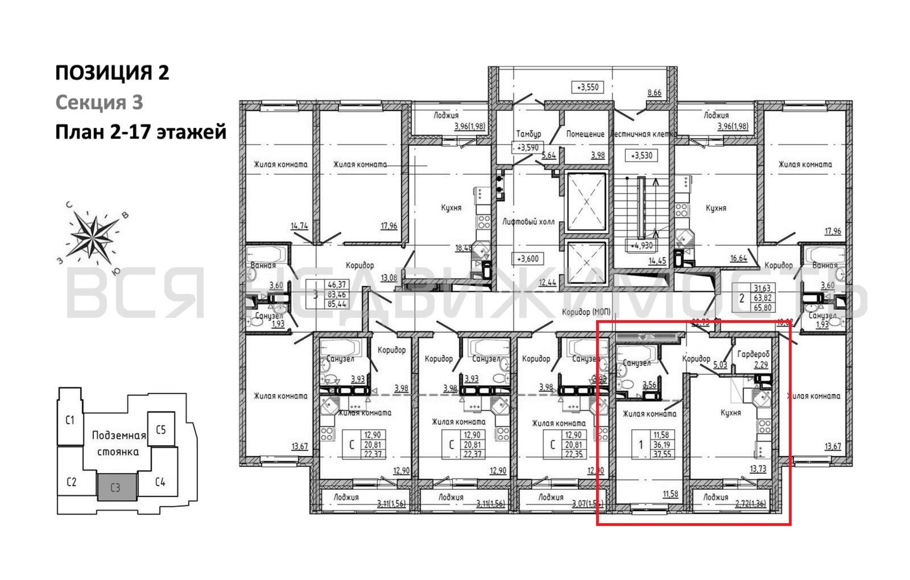 1-комнатная квартира, 37.55 м² 3/18 этаж ID объекта 100133427