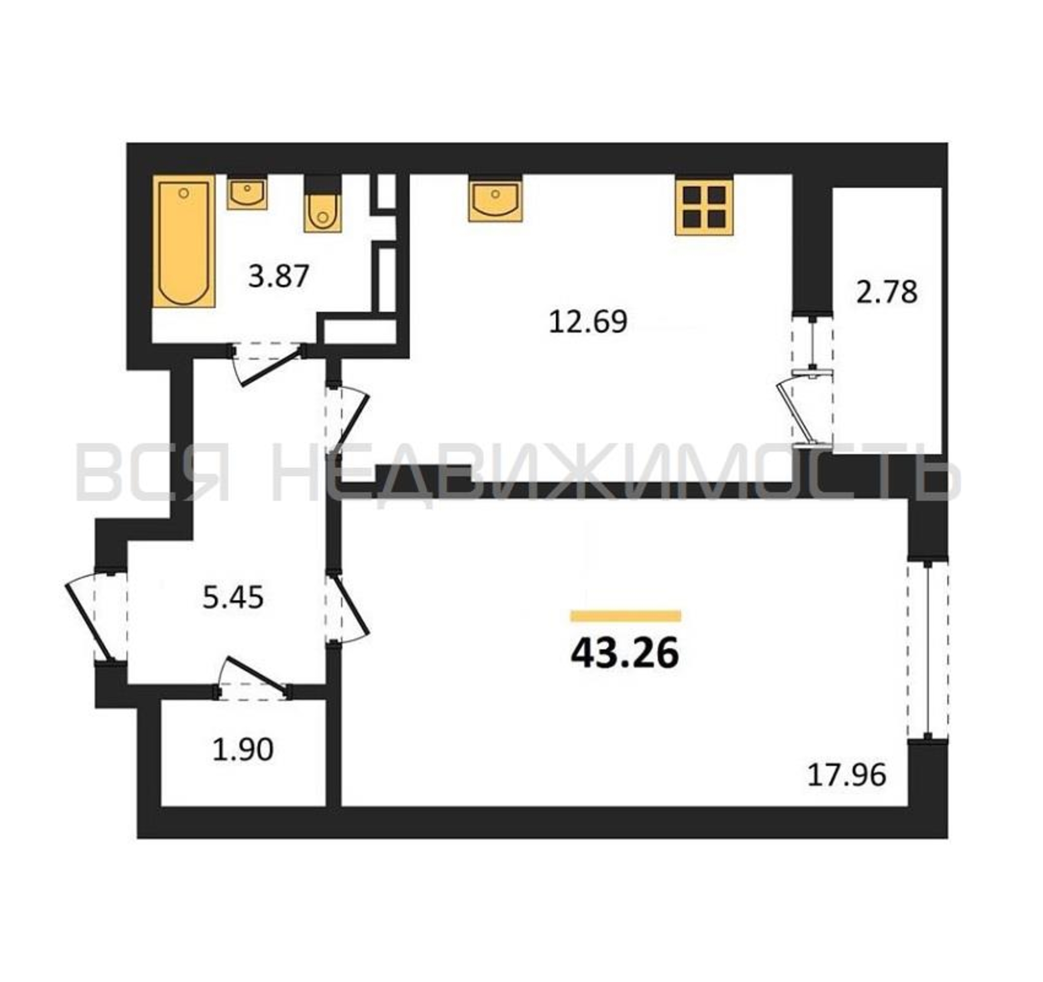 1-комнатная квартира, 43.26 м² 13/18 этаж ID объекта 100133599