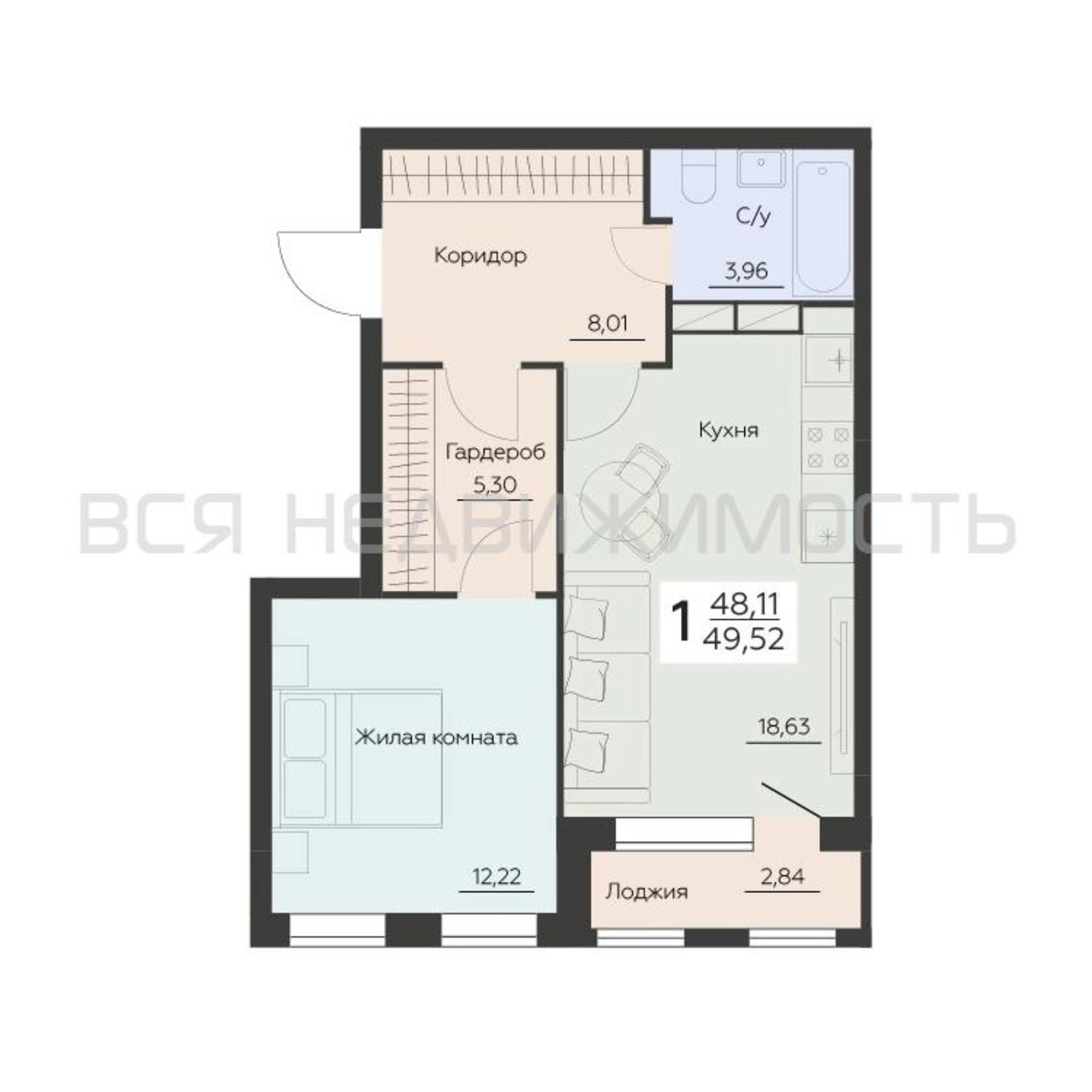 1-комнатная квартира, 49.52 м² 6/16 этаж ID объекта 100133745