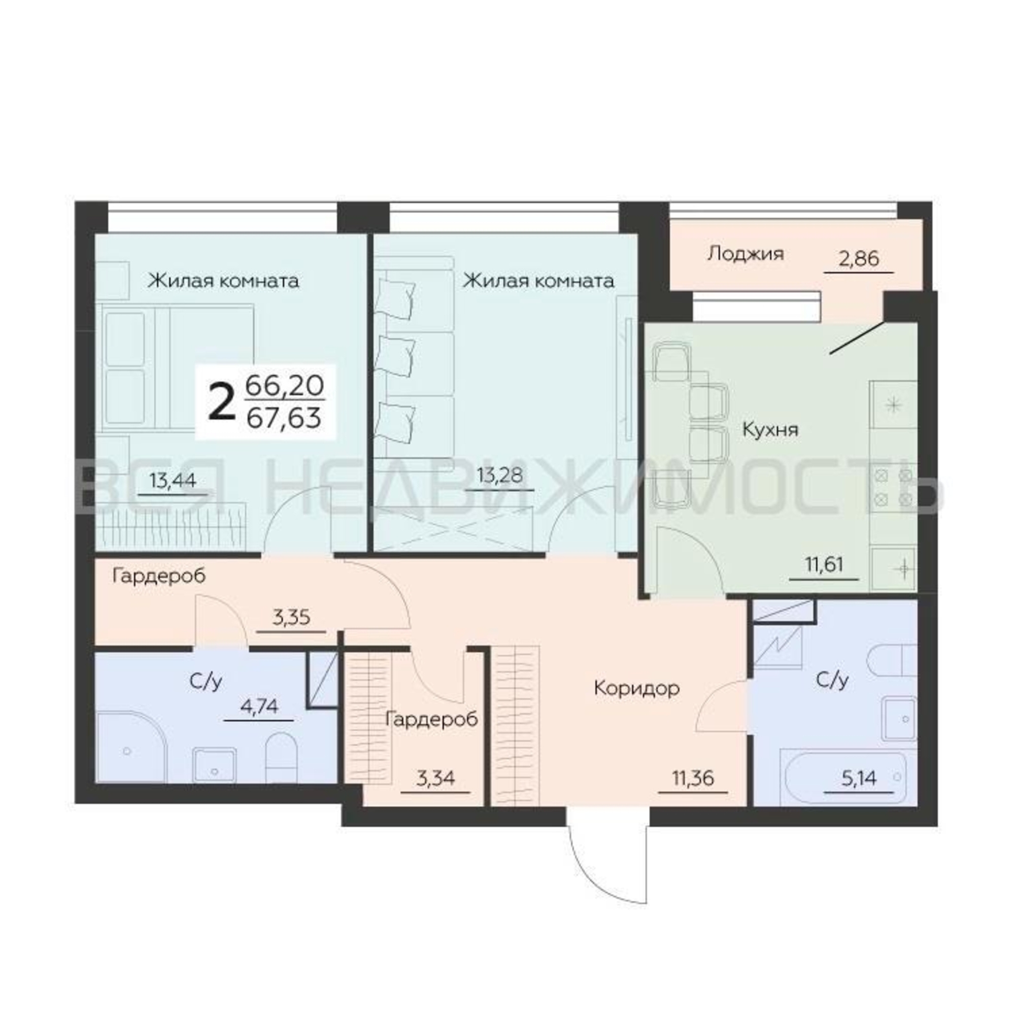 2-комнатная квартира, 67.63 м² 11/16 этаж ID объекта 100133788