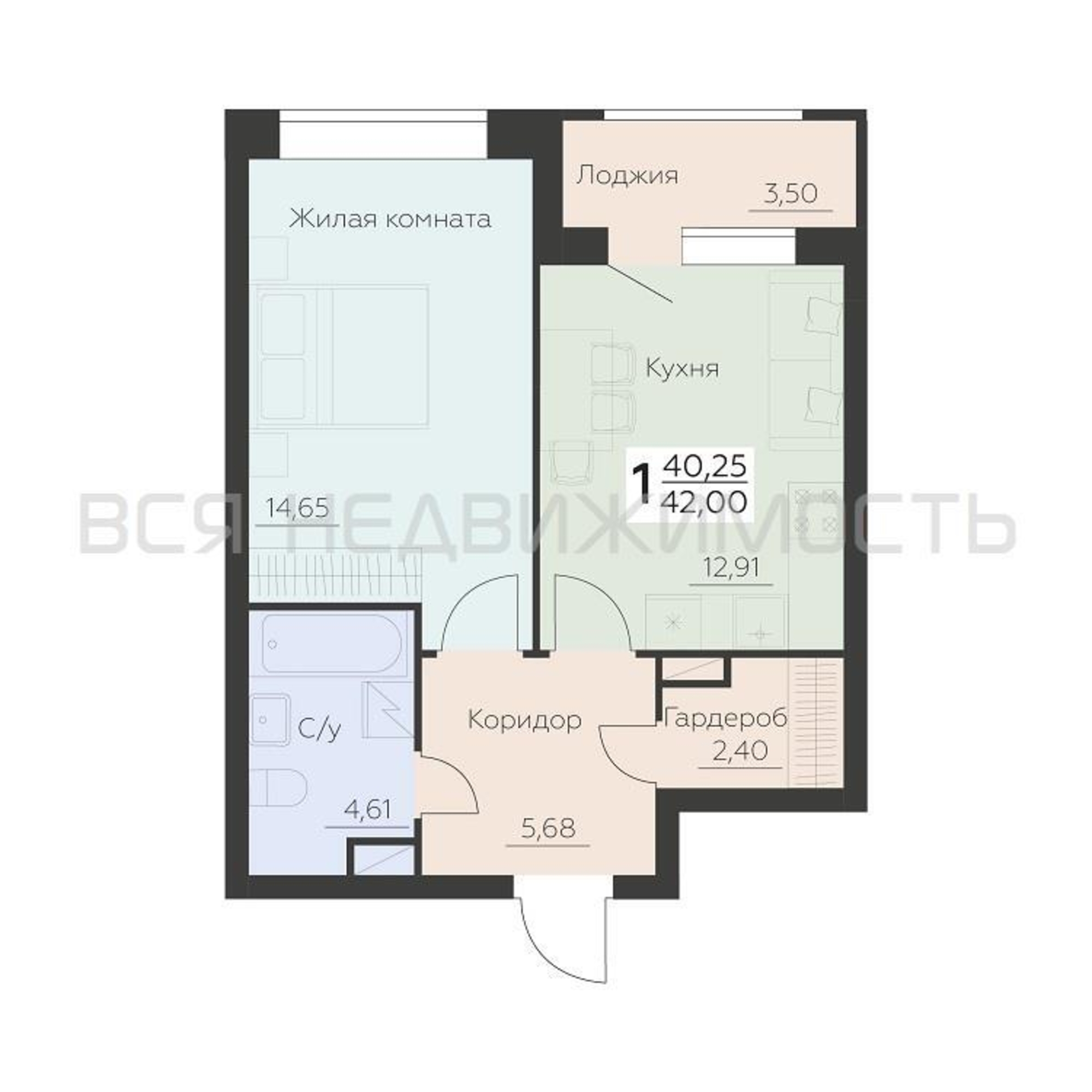 1-комнатная квартира, 42.00 м² 5/16 этаж ID объекта 100133850