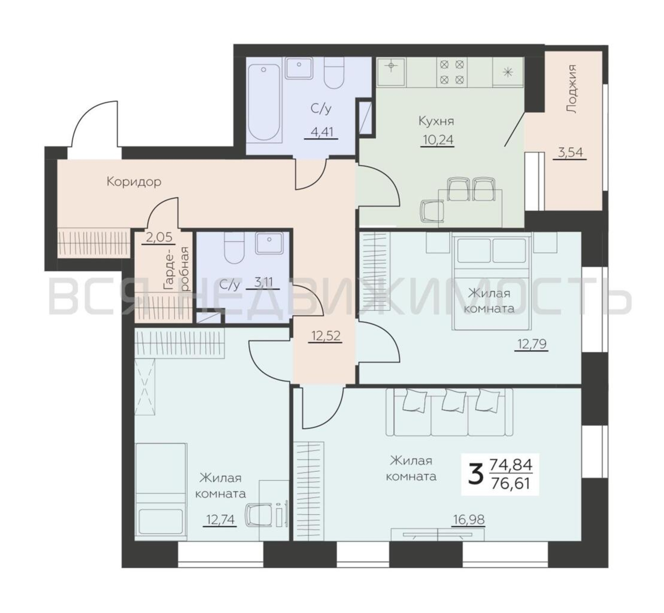 3-комнатная квартира, 76.61 м² 4/16 этаж ID объекта 100133910