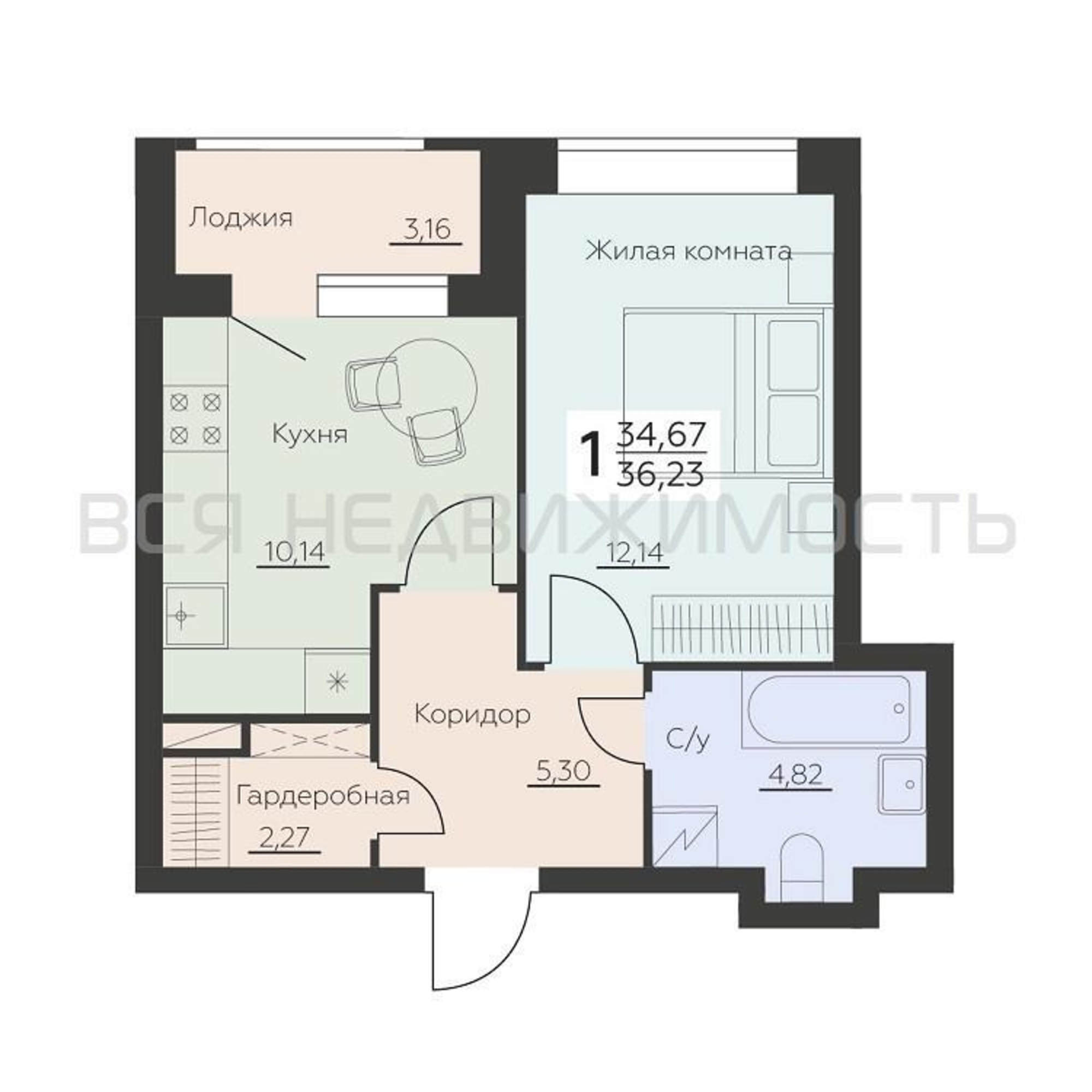1-комнатная квартира, 36.23 м² 5/14 этаж ID объекта 100133918