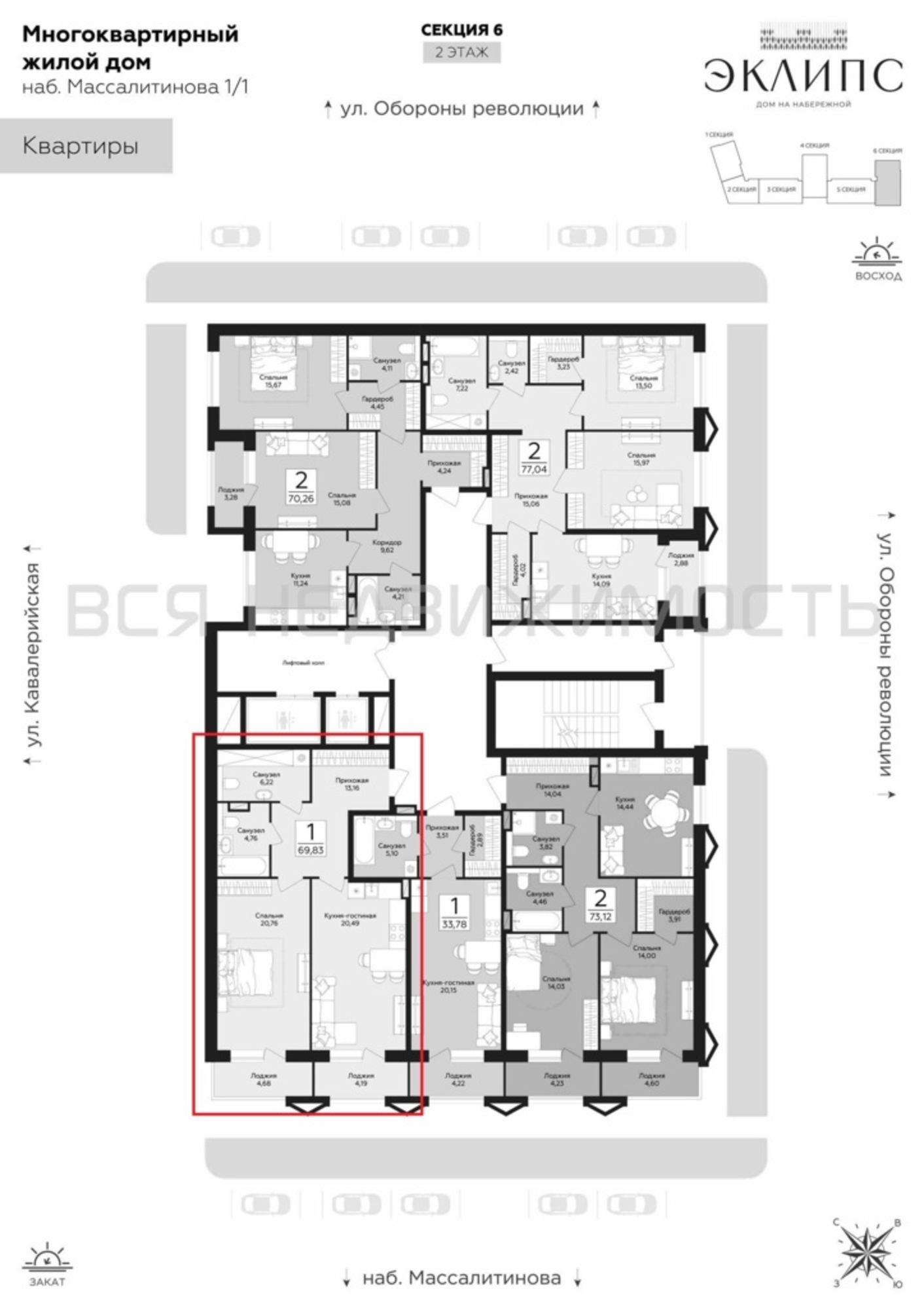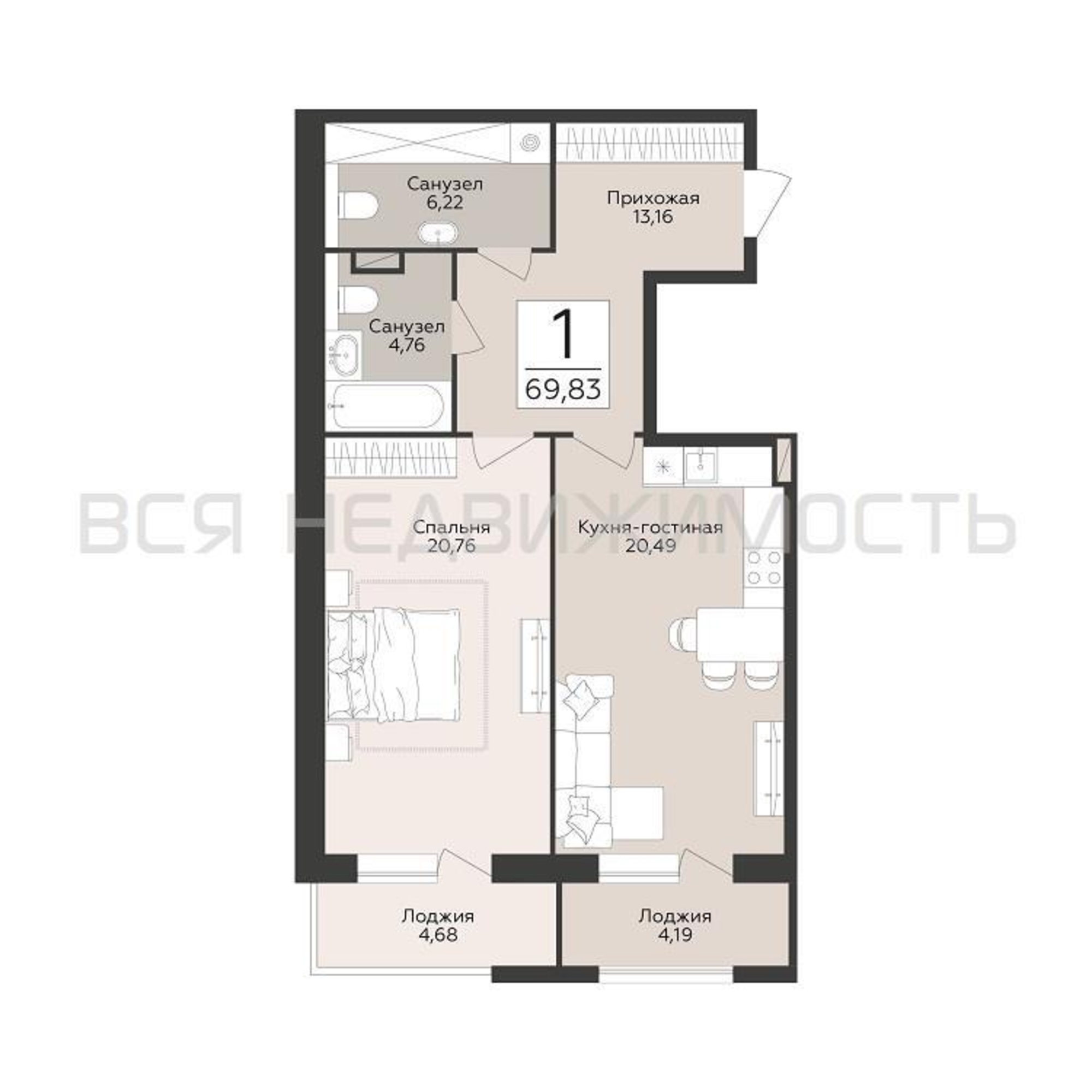1-комнатная квартира, 69.83 м² 2/12 этаж ID объекта 100134536