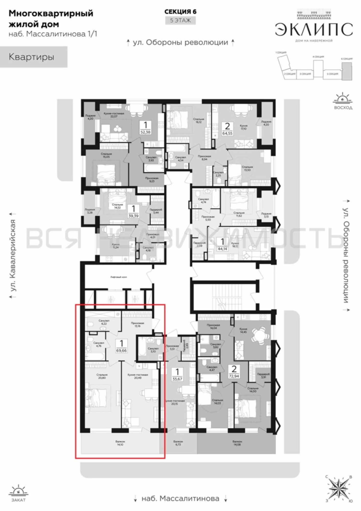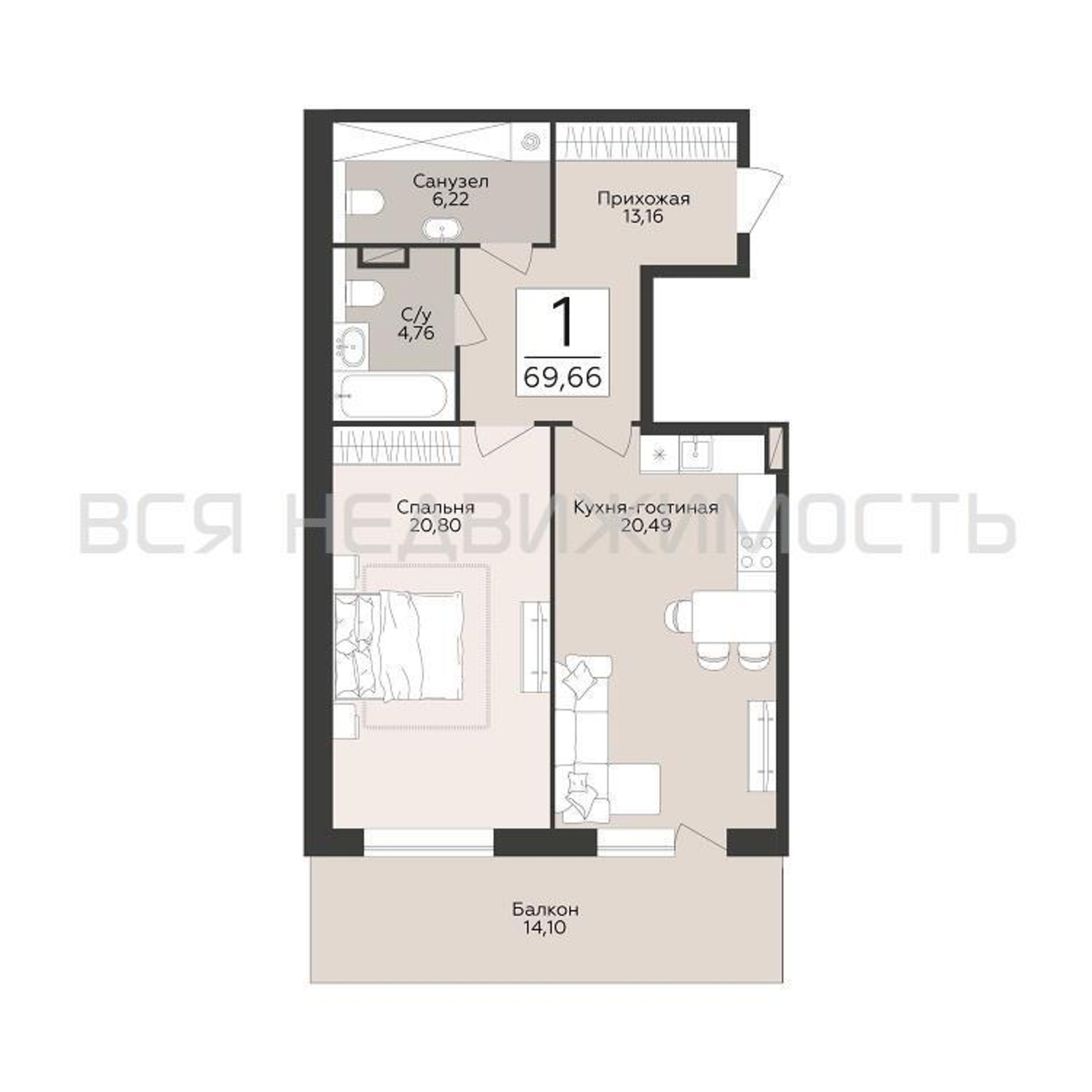 1-комнатная квартира, 69.66 м² 5/12 этаж ID объекта 100134555