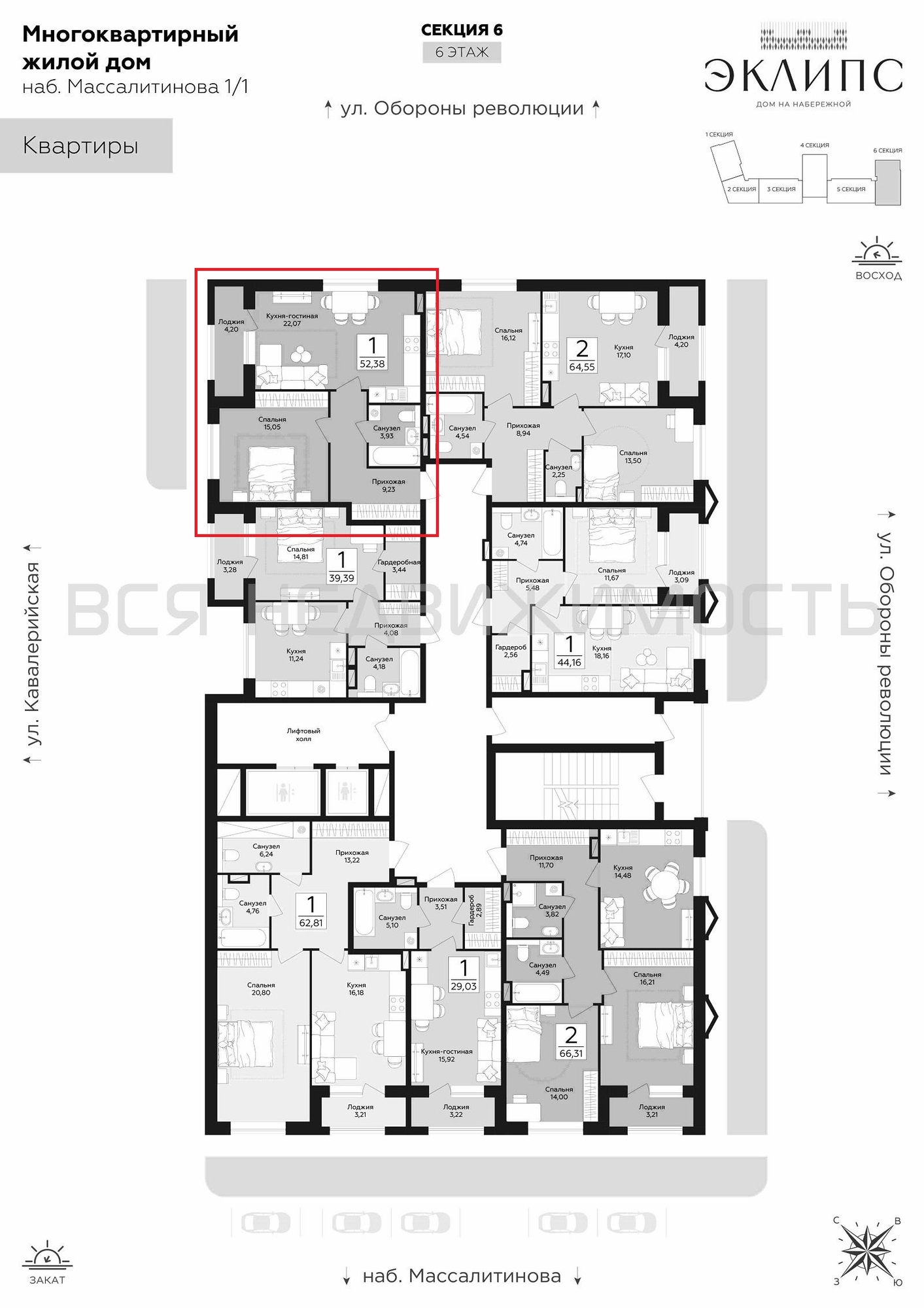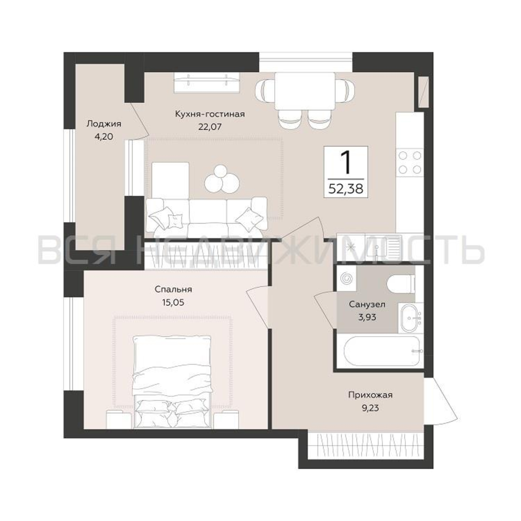 1-комнатная квартира, 52.38 м² 6/12 этаж ID объекта 100134564