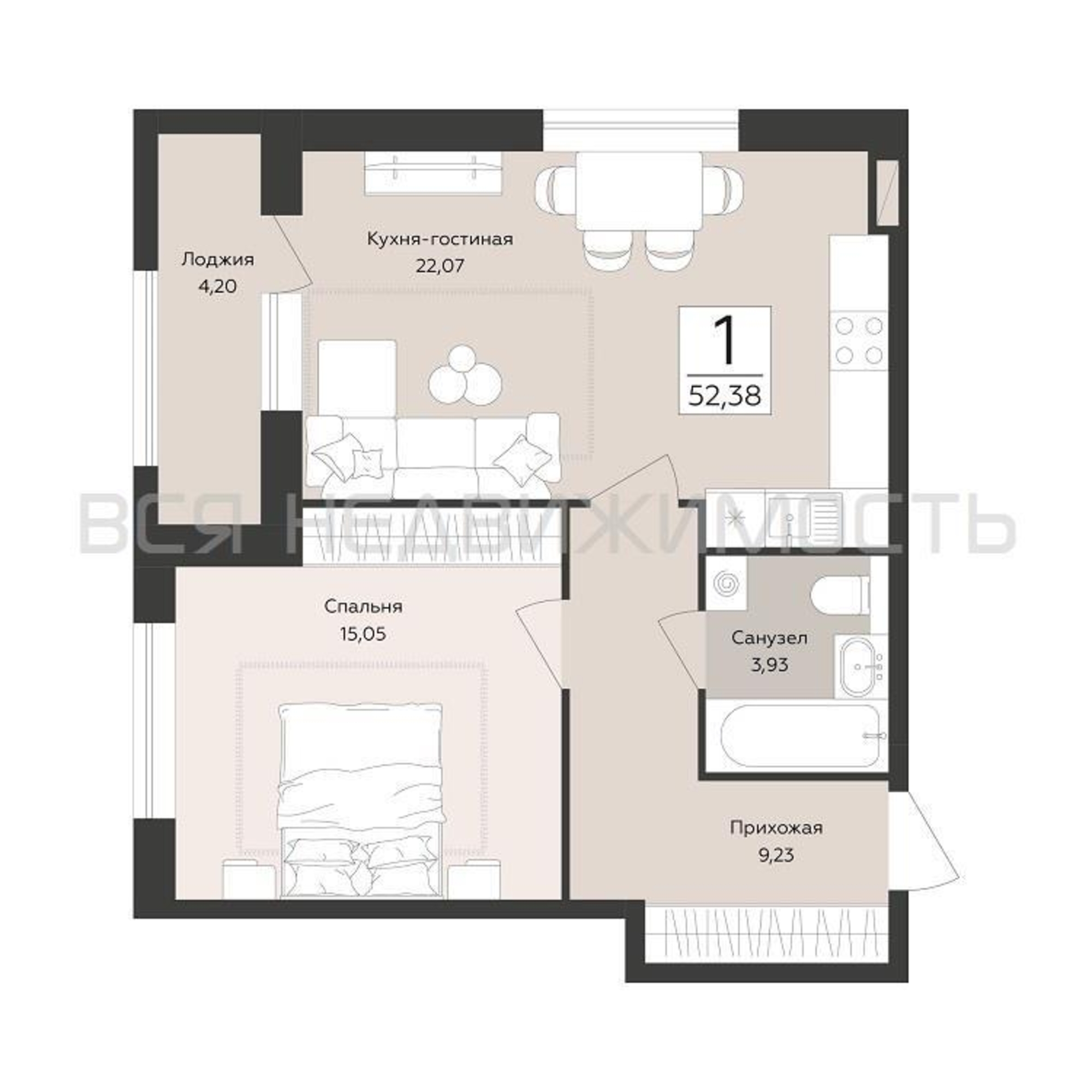 1-комнатная квартира, 52.38 м² 8/12 этаж ID объекта 100134576