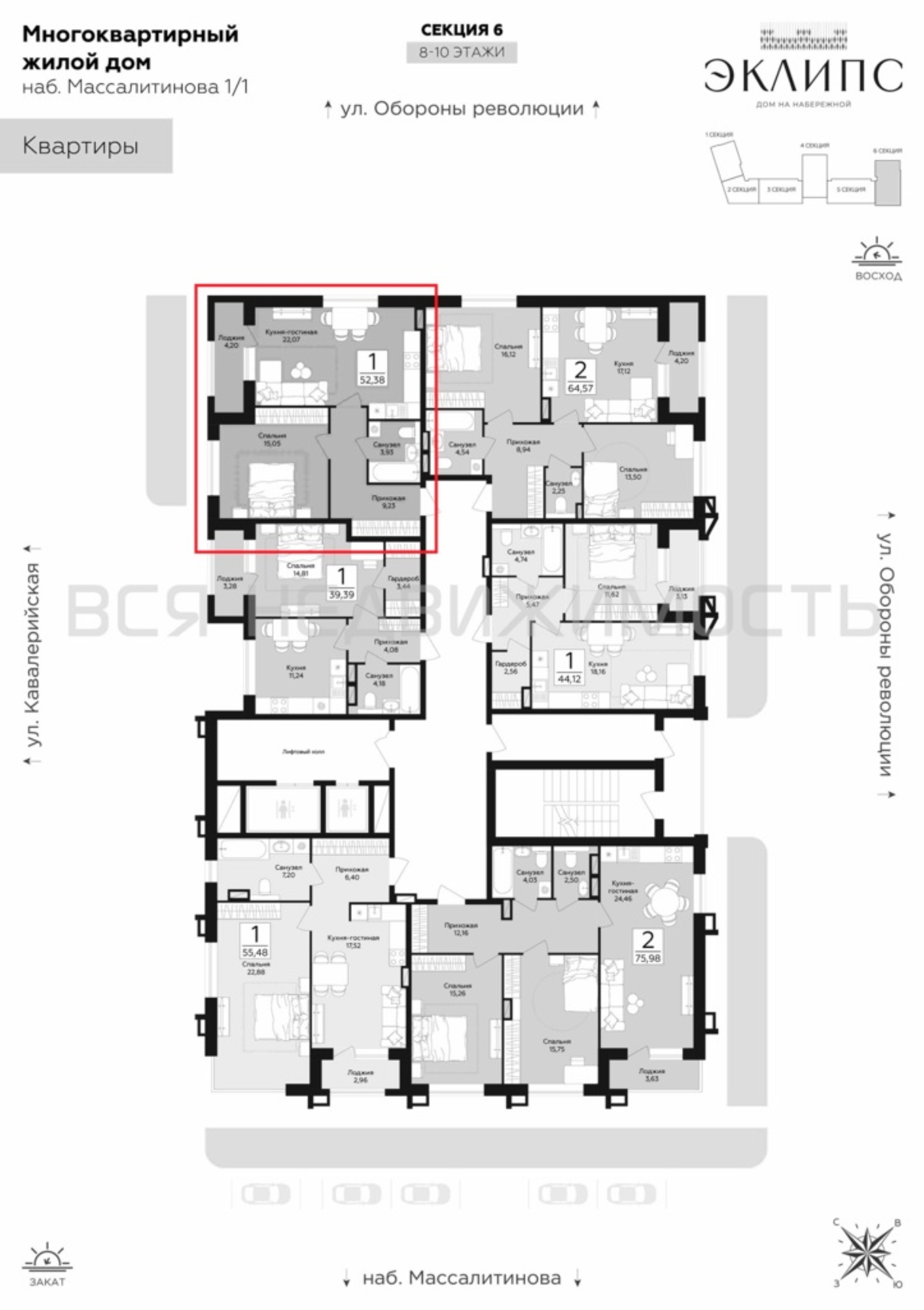 1-комнатная квартира, 52.38 м² 9/12 этаж ID объекта 100134582