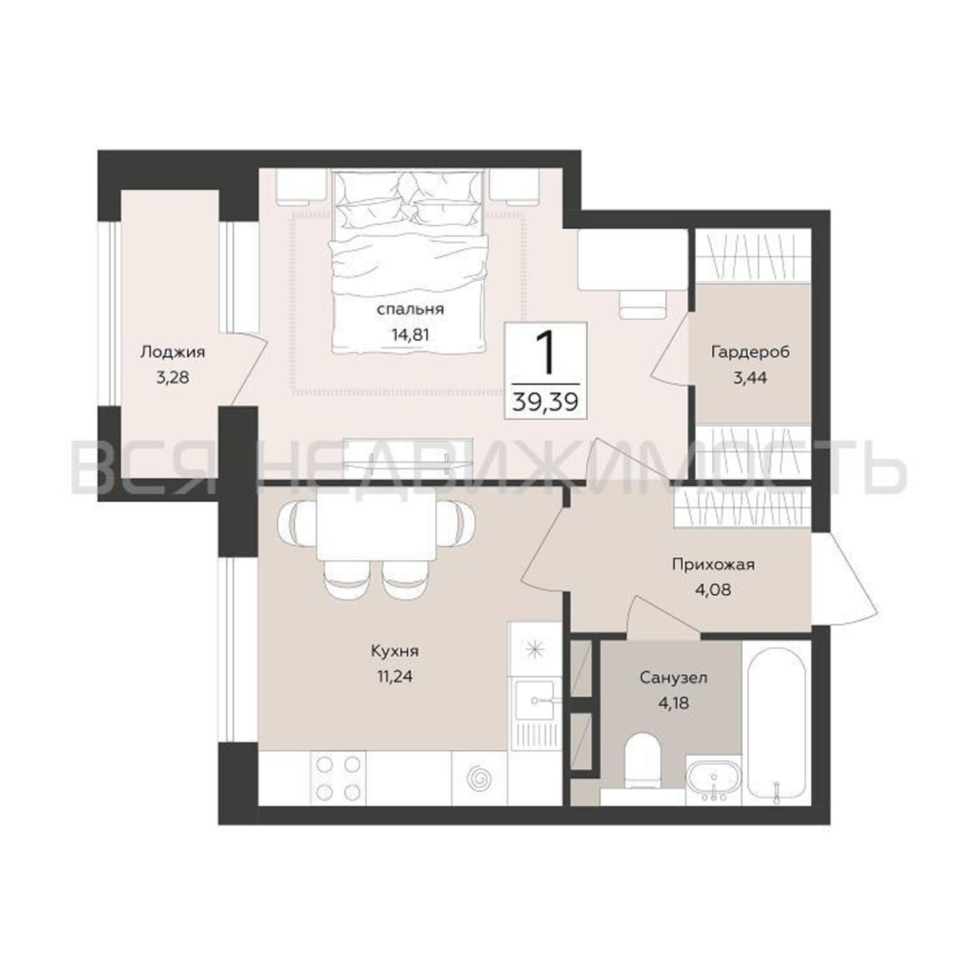 1-комнатная квартира, 39.39 м² 10/12 этаж ID объекта 100134587