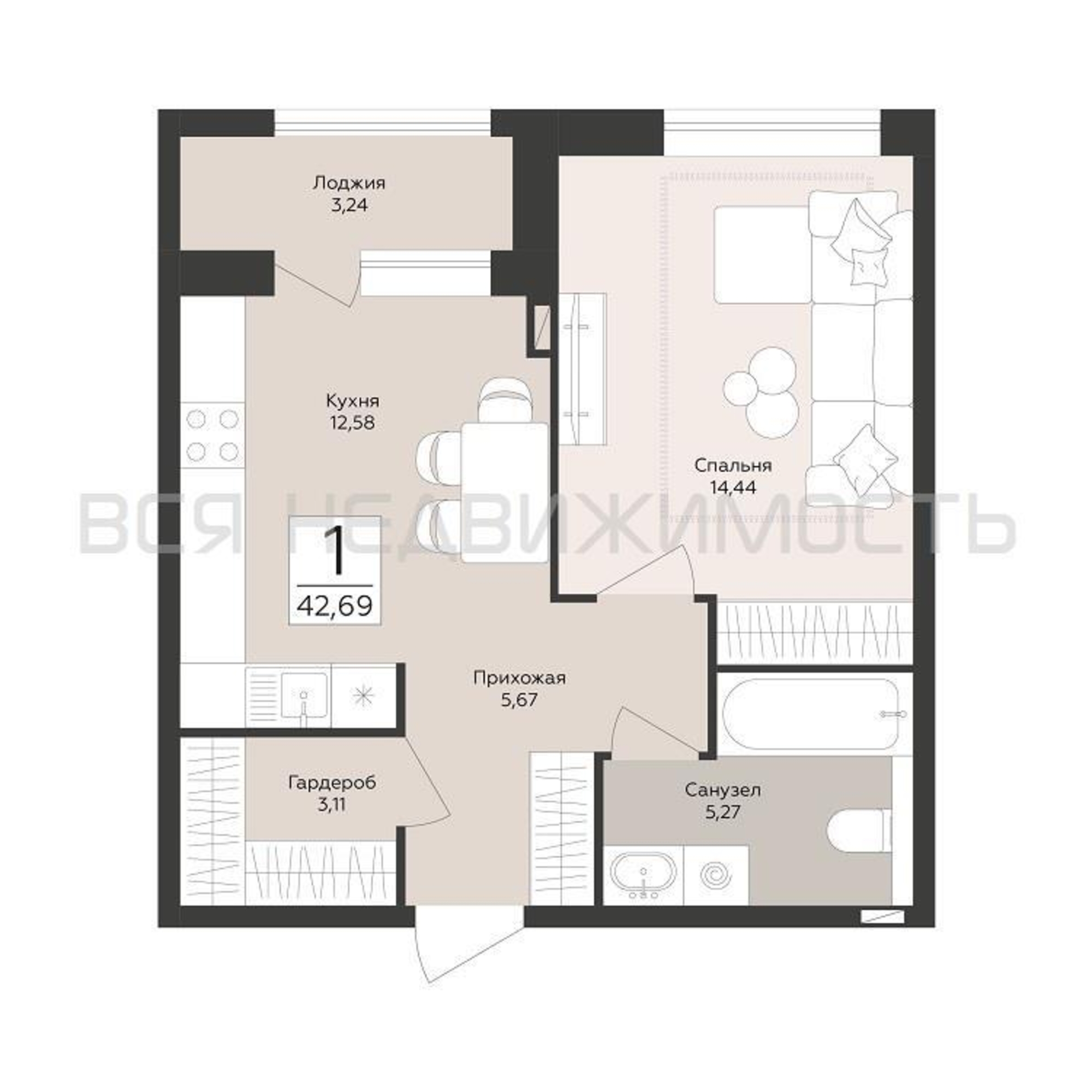 1-комнатная квартира, 42.69 м² 3/12 этаж ID объекта 100134615