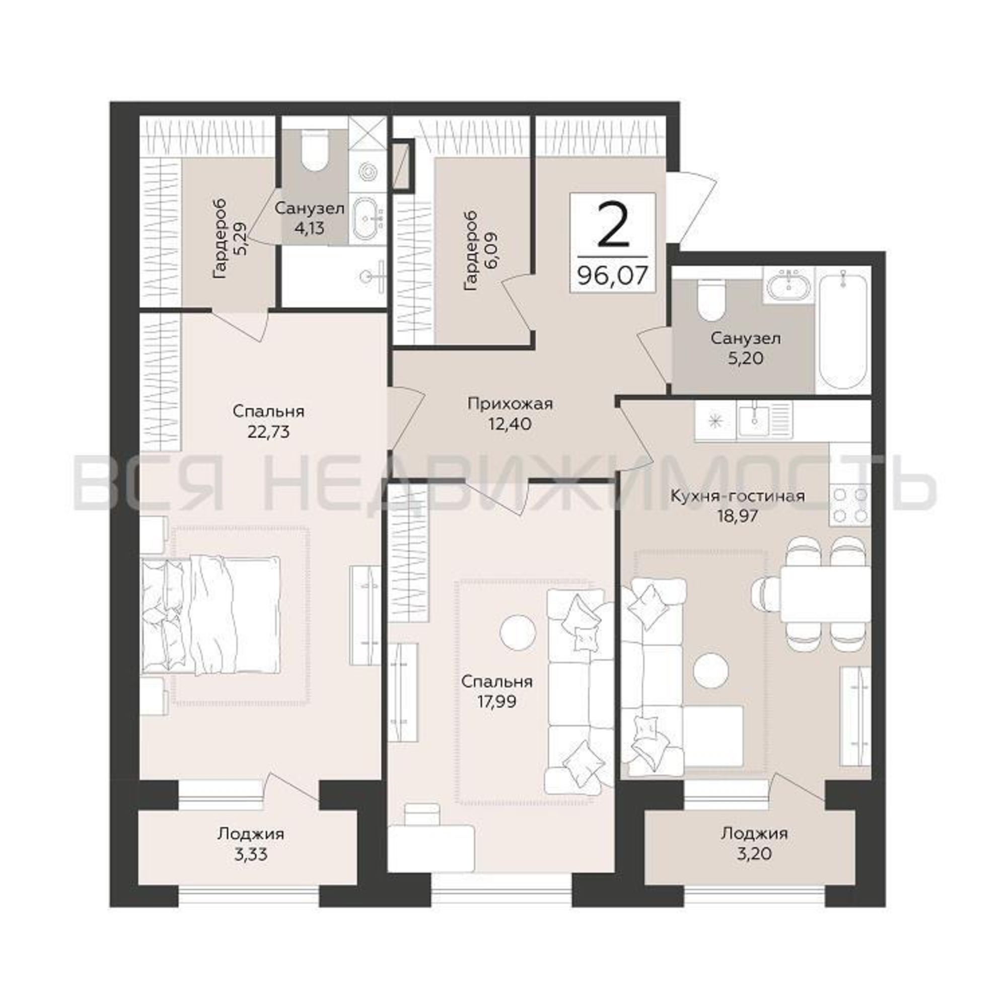 2-комнатная квартира, 96.07 м² 4/12 этаж ID объекта 100134653