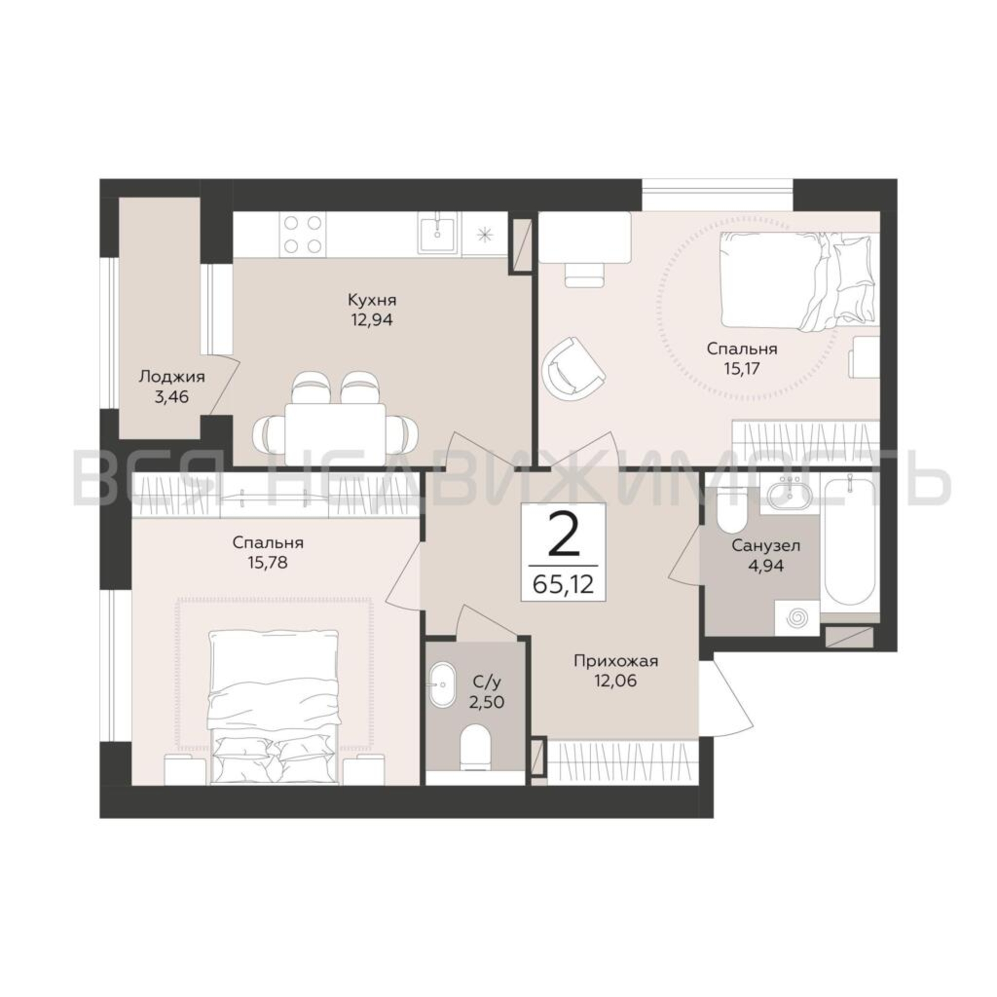 2-комнатная квартира, 65.12 м² 8/12 этаж ID объекта 100134675