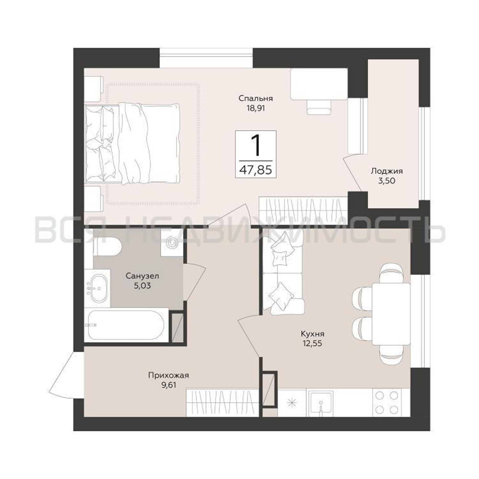 1-комнатная квартира, 47.85 м² 8/12 этаж ID объекта 100134676
