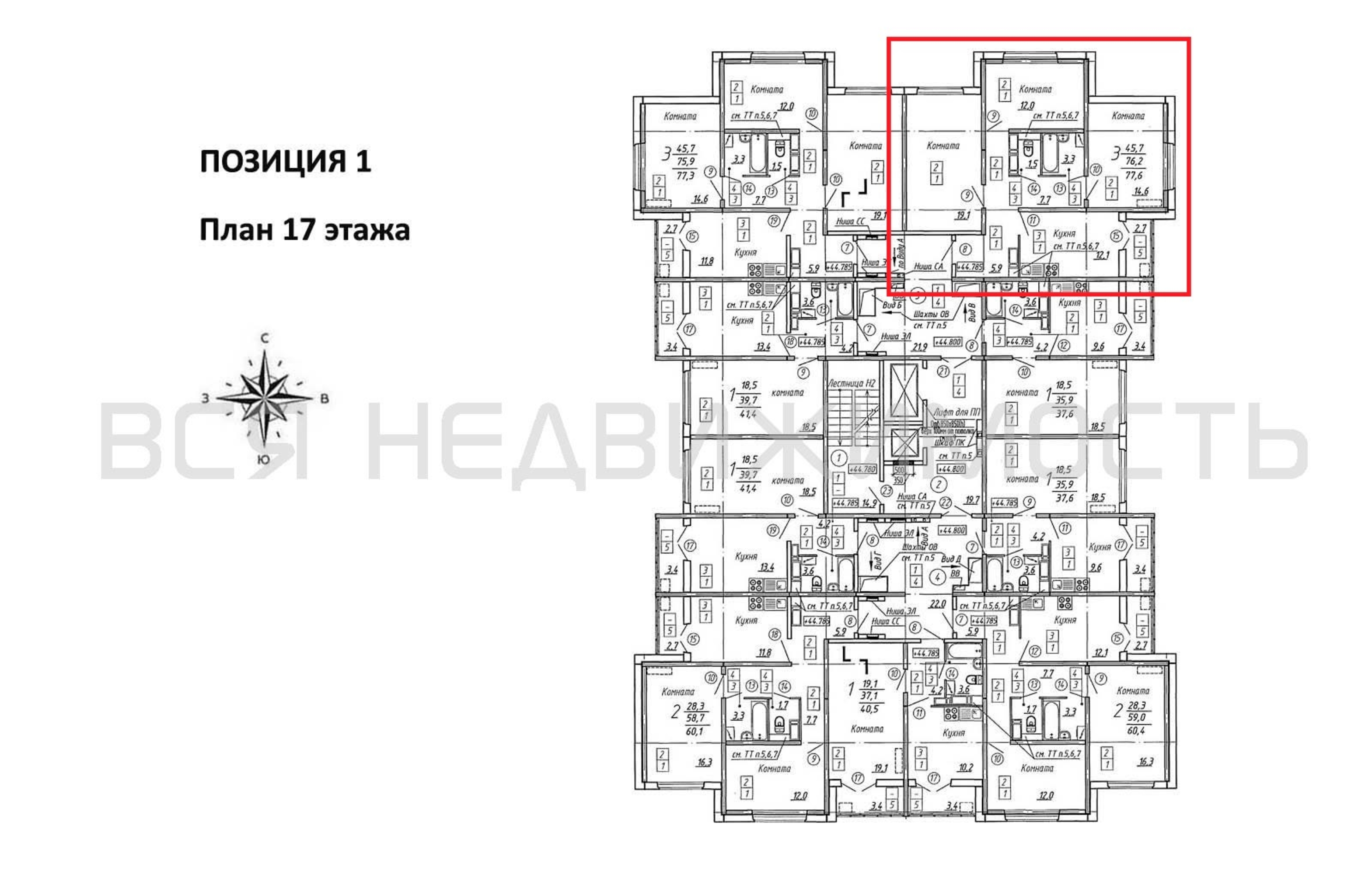 3-комнатная квартира, 77.60 м² 17/17 этаж ID объекта 100136197