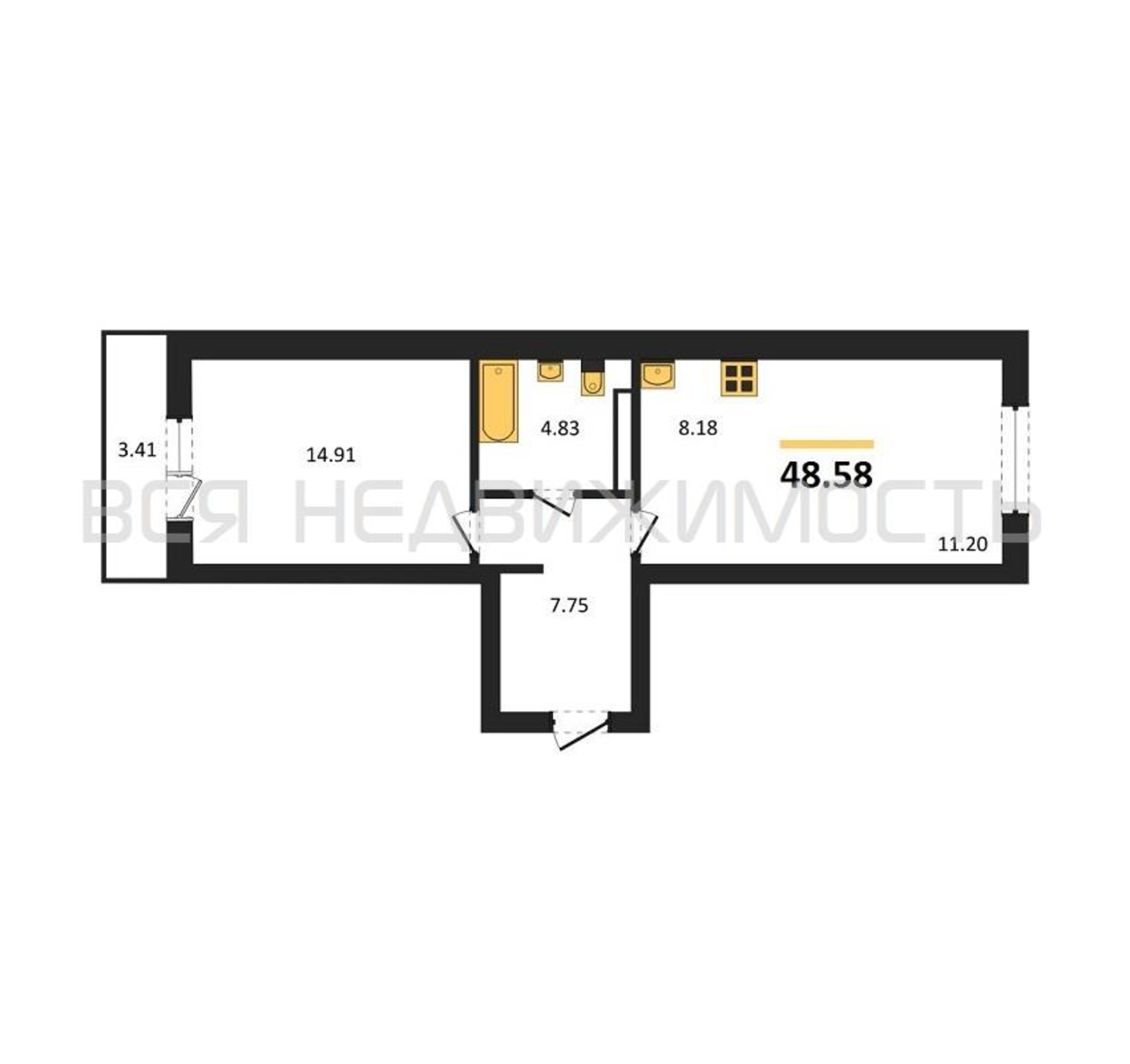 1-комнатная квартира, 48.58 м² 3/17 этаж ID объекта 100136520