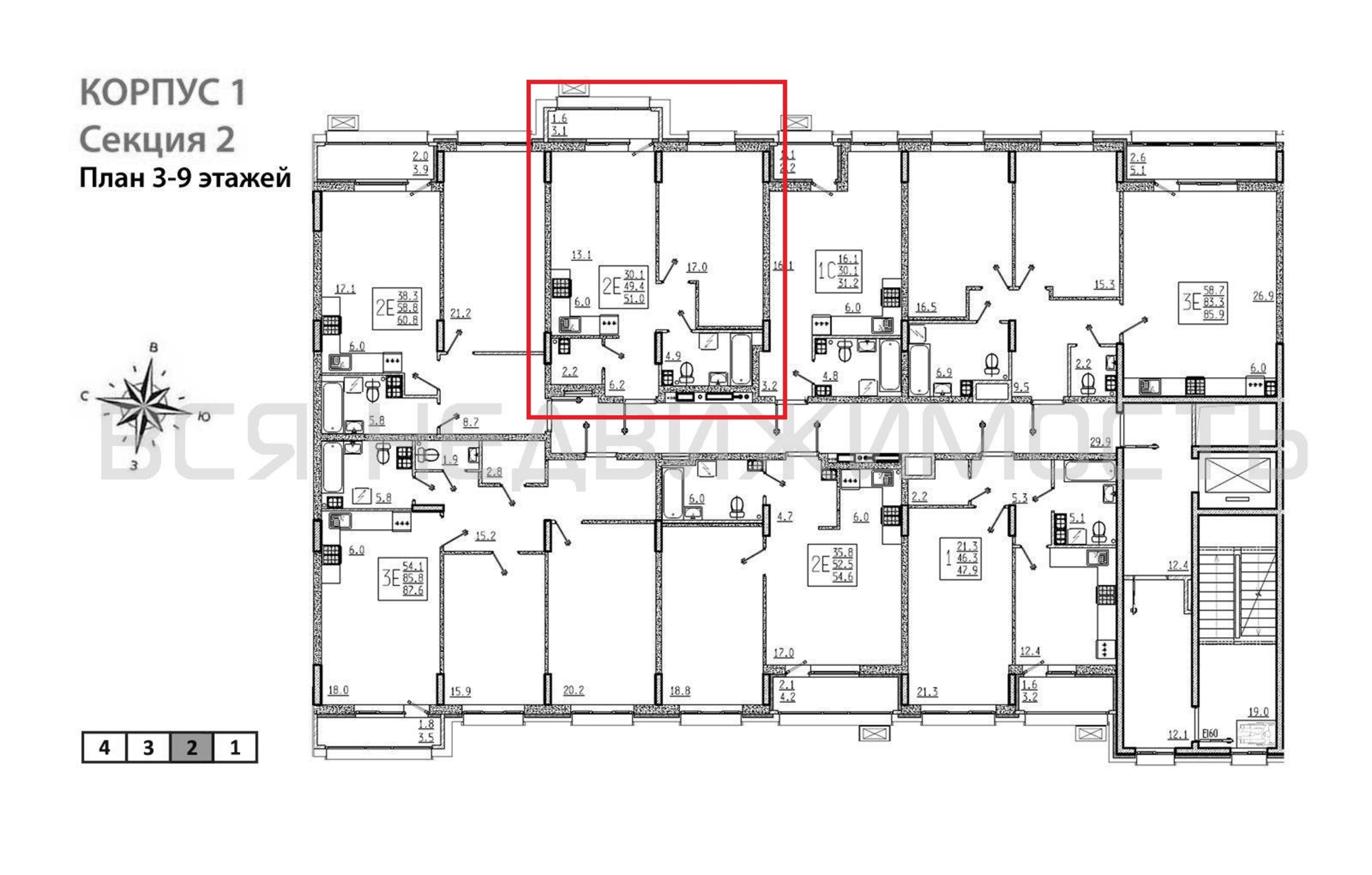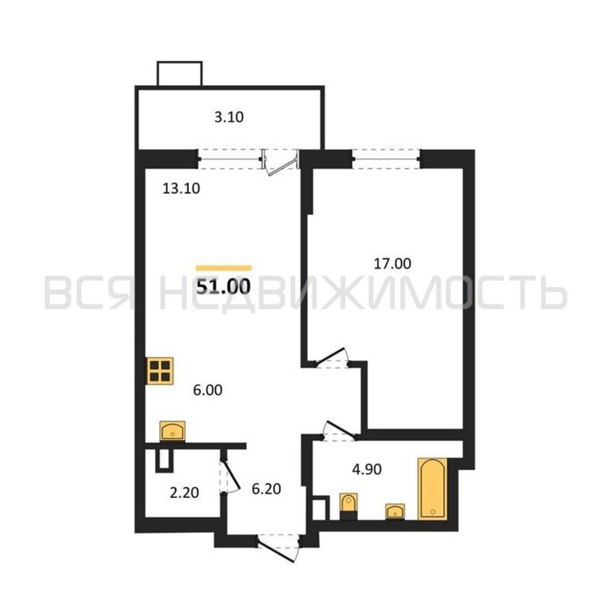 1-комнатная квартира, 51.00 м² 4/9 этаж ID объекта 100137149